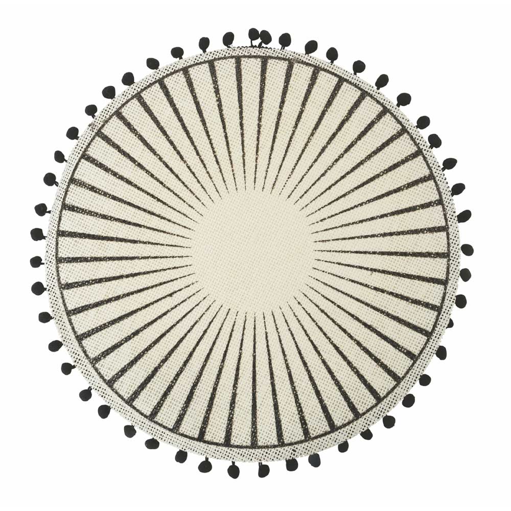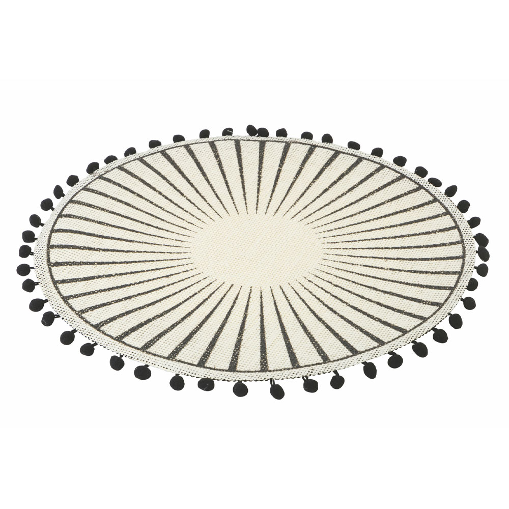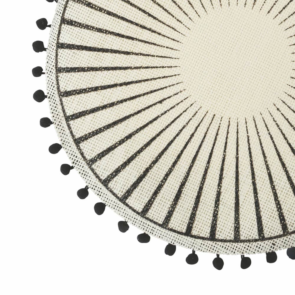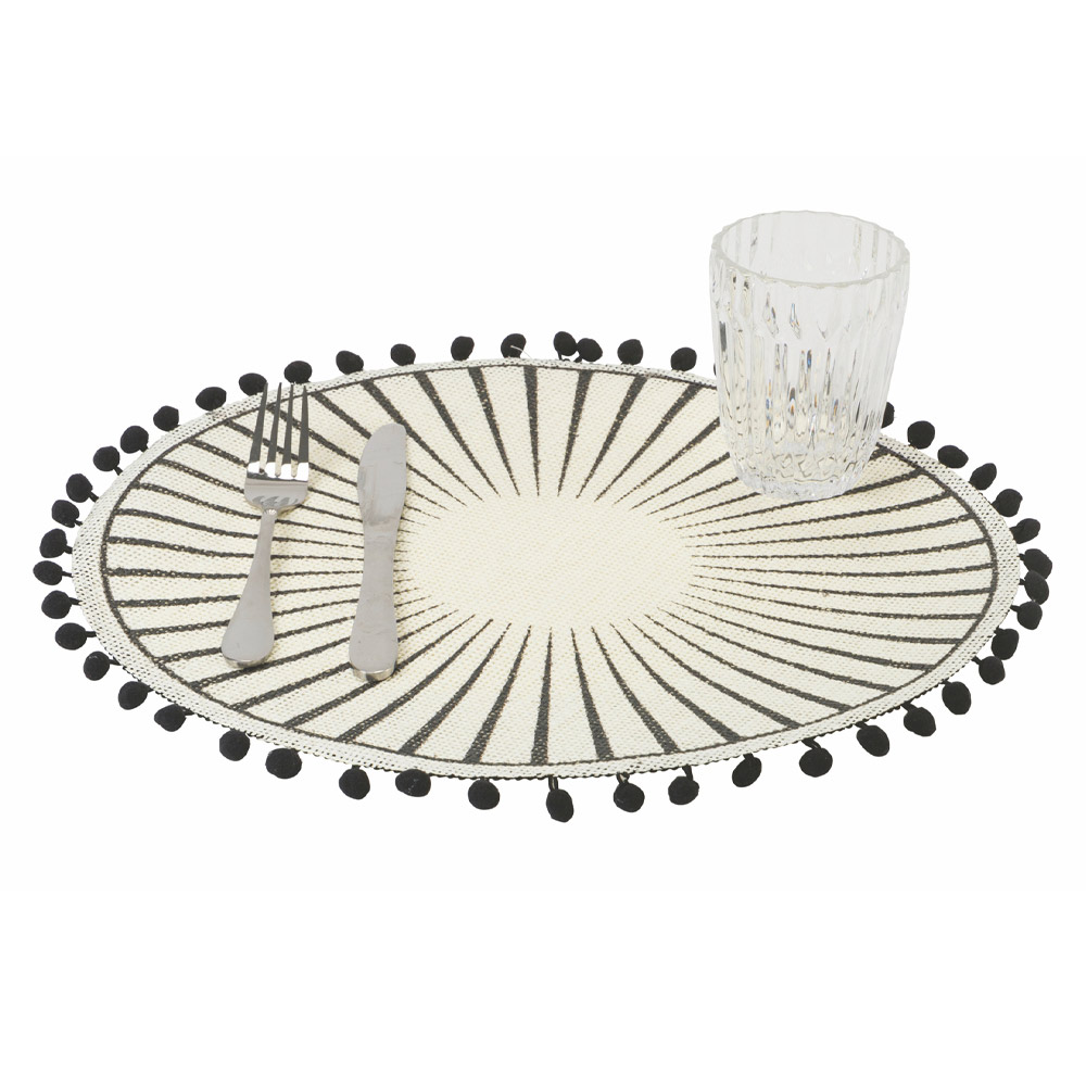 Round placemat set in white jute decorated with black pom poms, 12 pieces.