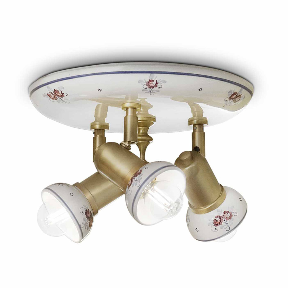 This round design3-spot ceiling light is entirely made in brass and ceramic with hand-painted floral decoration, to highlight the skill and manual skills of the artisans. The design is characterized by the functionality of the original light points with a precious design with the brass chosen for the metal parts that warms and gives a touch of elegance.