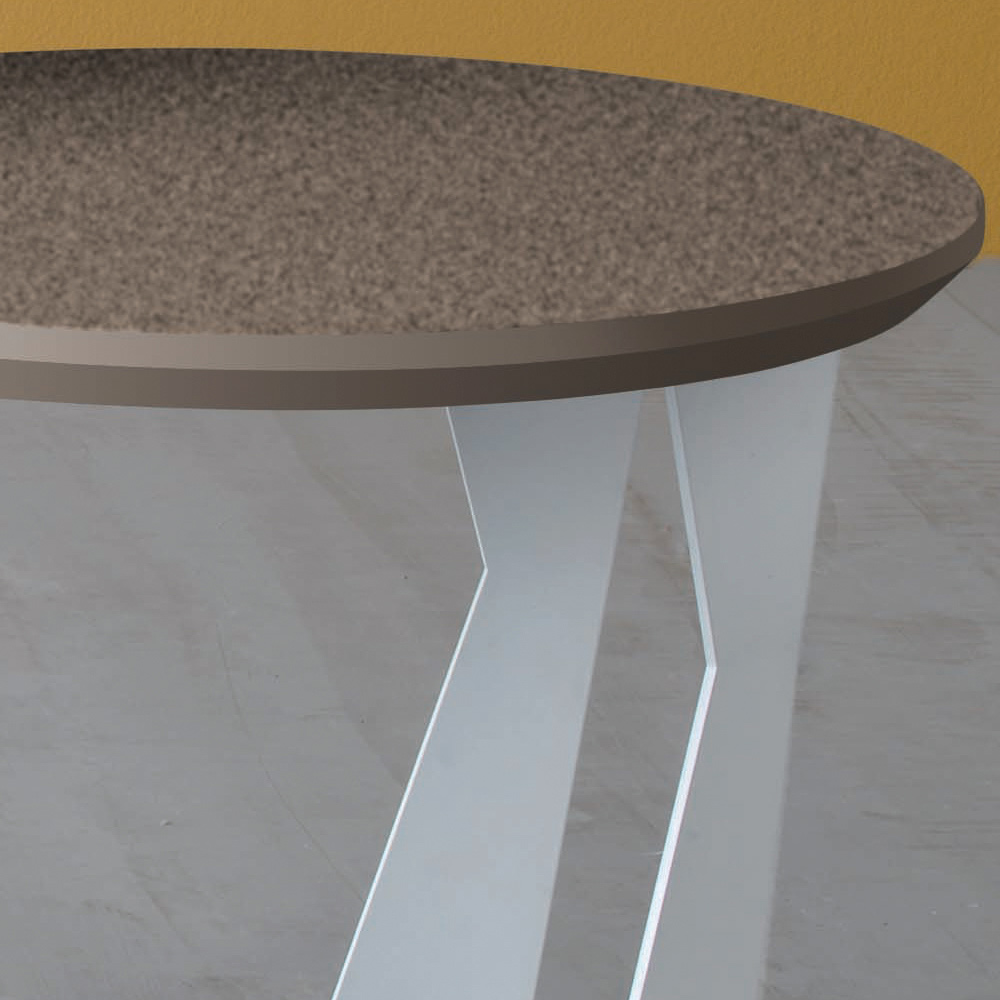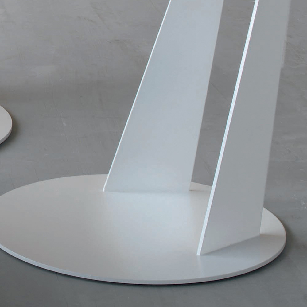 This round coffee table features a powder-coated embossed white metal baseand a matte ceramic top on panel. Its peculiarity is given by the structure composed of inclined elements that create graphic and chromatic games of great effect, for a lively and modern spirit. The choice of increasingly sustainable materials and processes combined with a refined and linear taste gives life to a contemporary and experiential design of high quality totally Made in Italy .