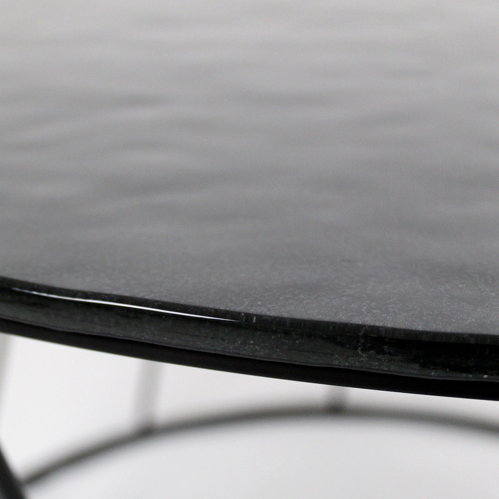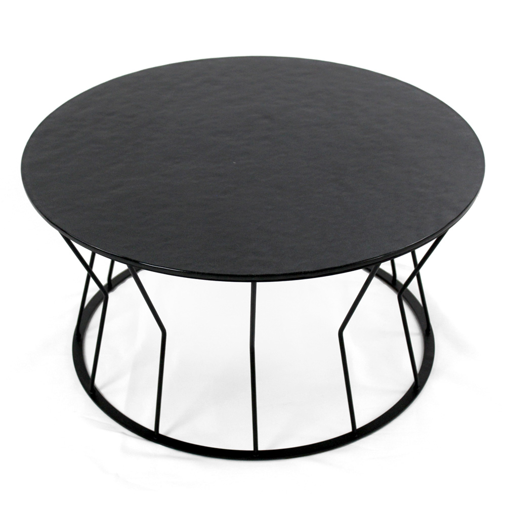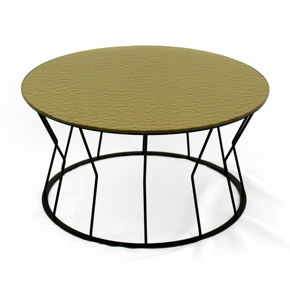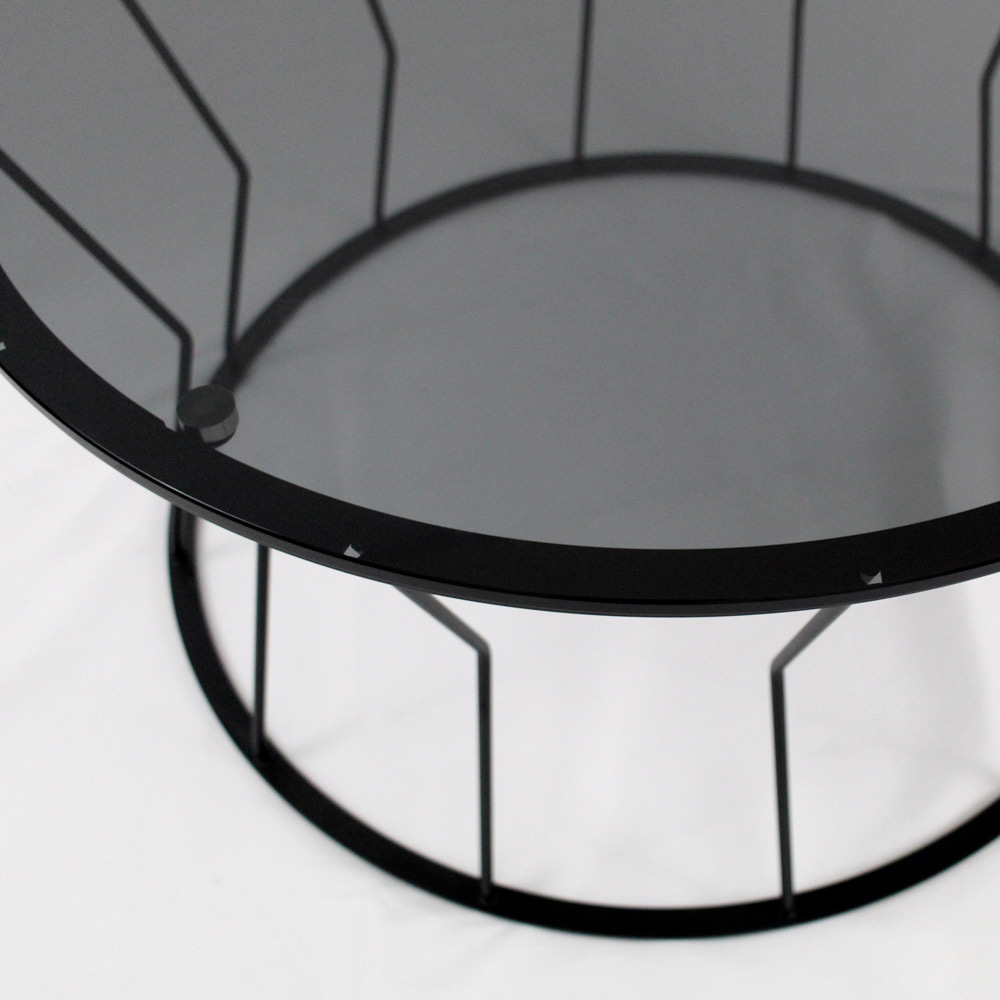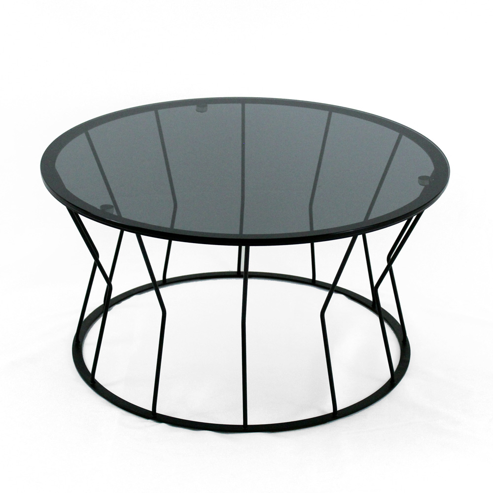 Round coffee table with painted steel base and glass top.