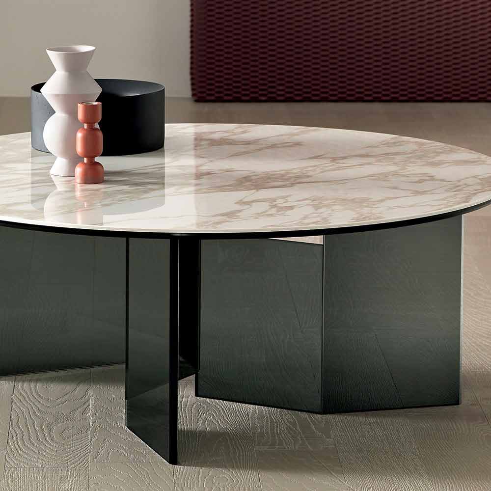 Made of smoked glass for the base and a polished arabesque calacatta ceramic top , it is a piece of furniture handcrafted in Italy with high quality materials ideal for the living area.