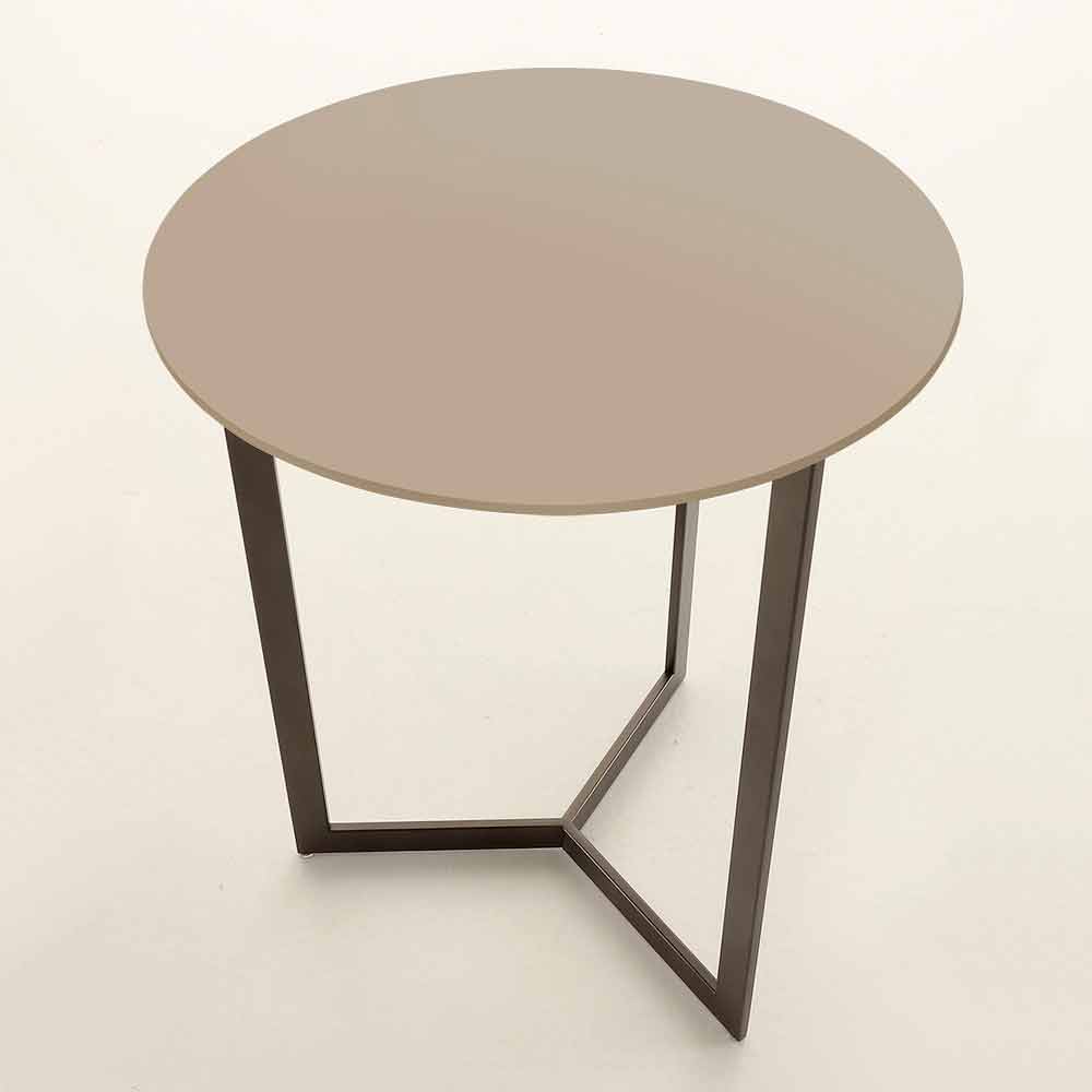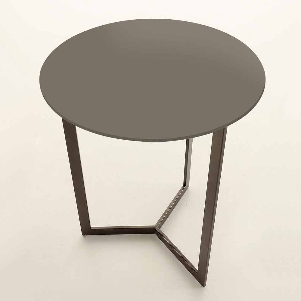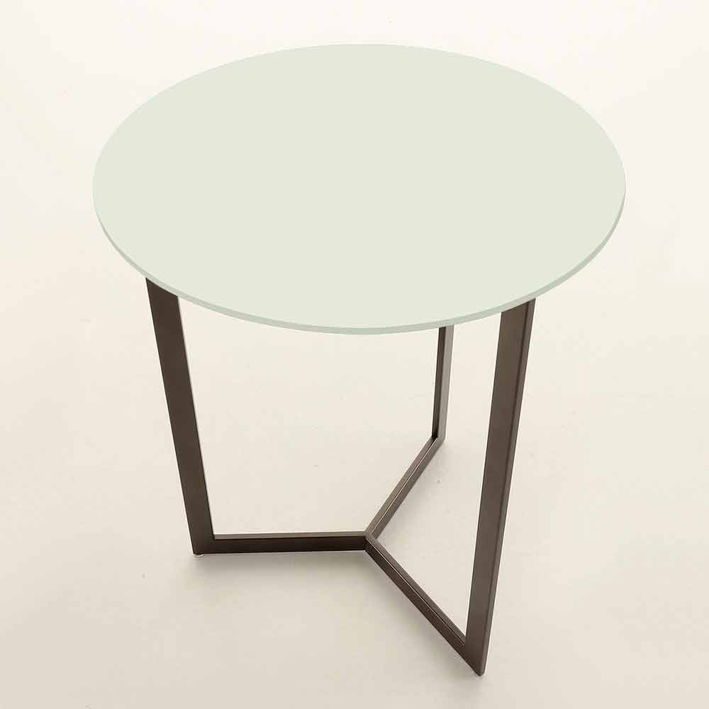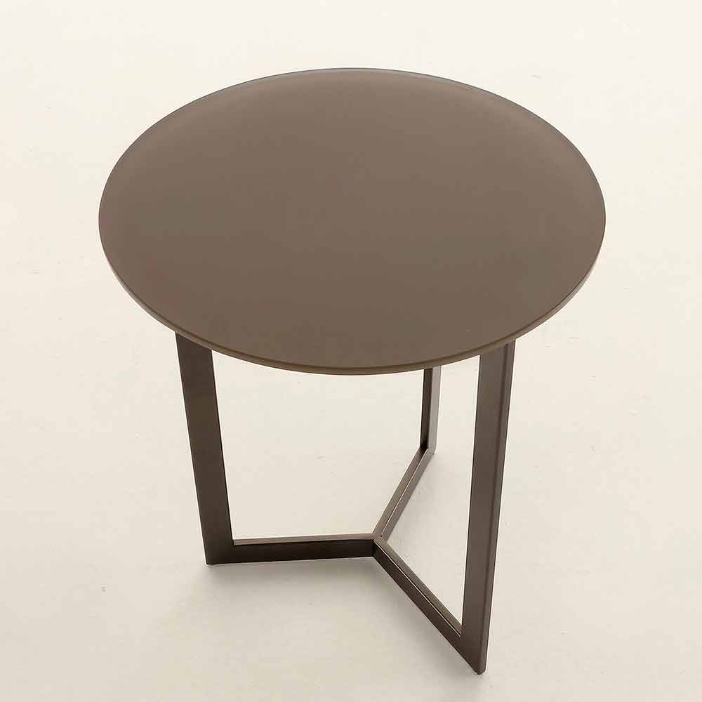 Simple and elegant coffee table made in Italy with round top in anti-fingerprint satin glass and structure in brown painted metal .