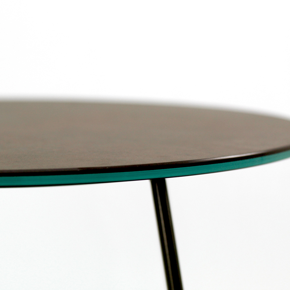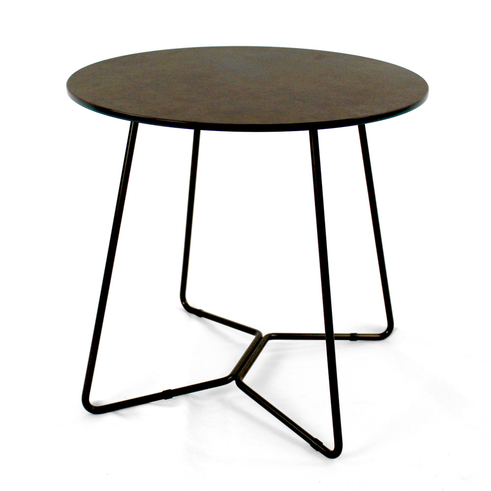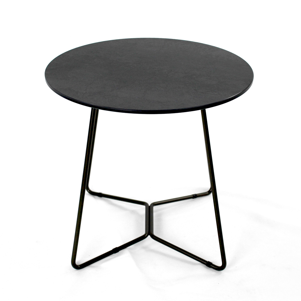 Round coffee table with painted steel base and porcelain stoneware top.