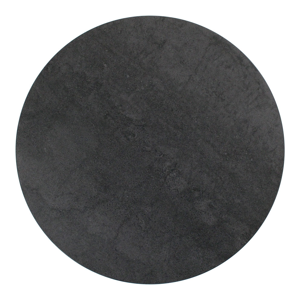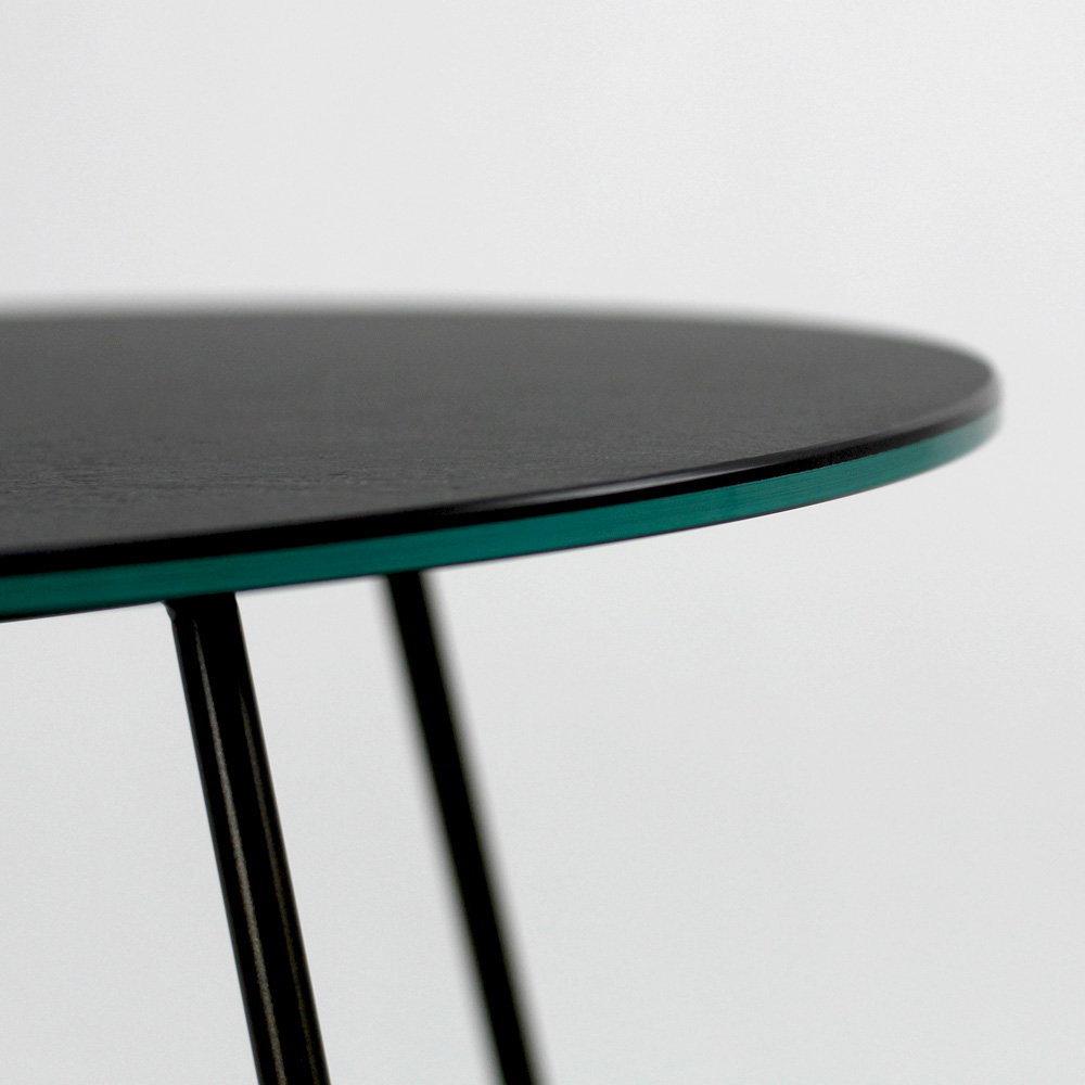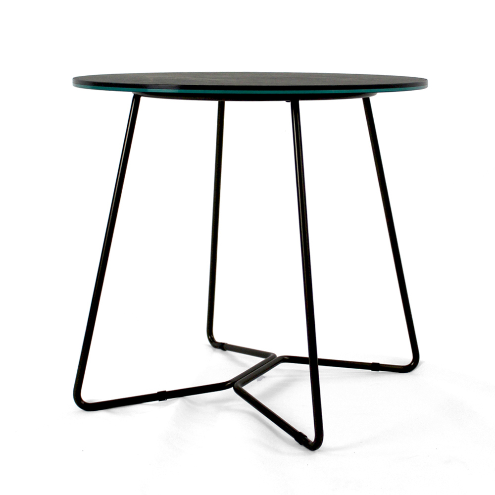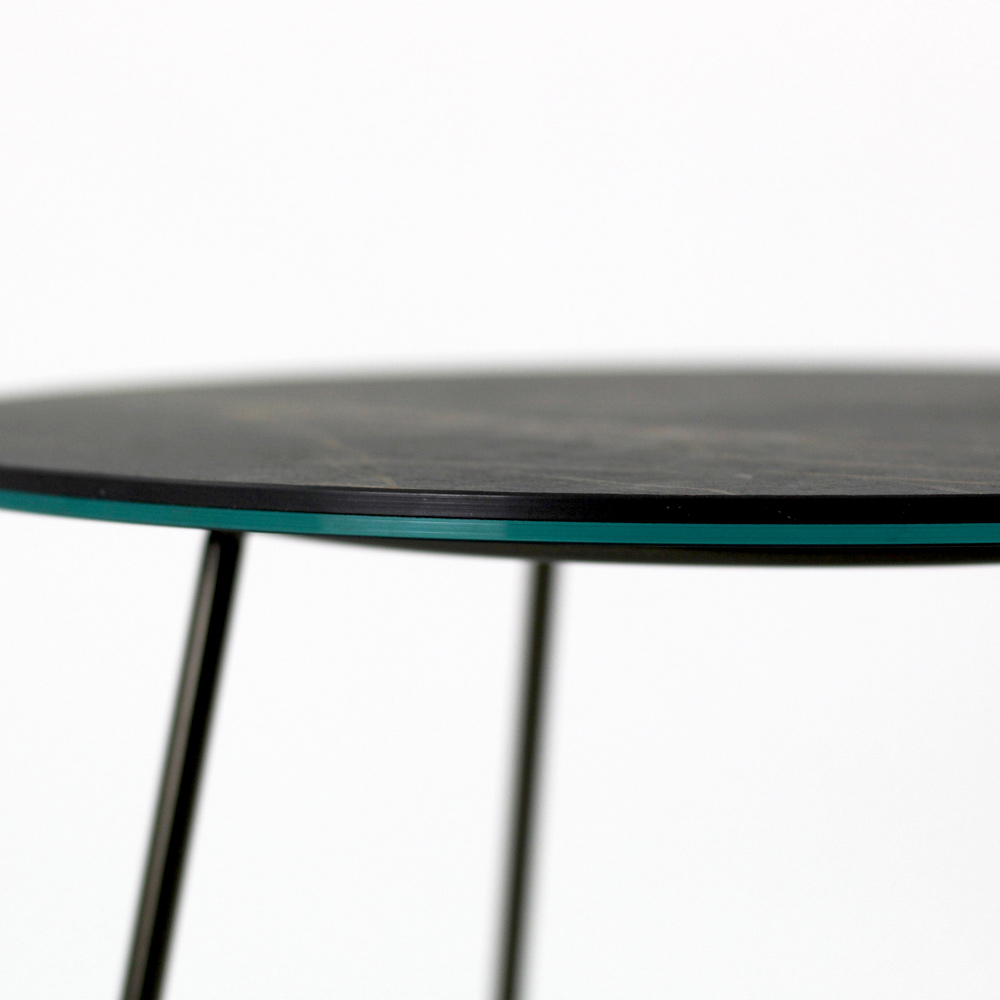 Round coffee table with painted steel base and porcelain stoneware top.