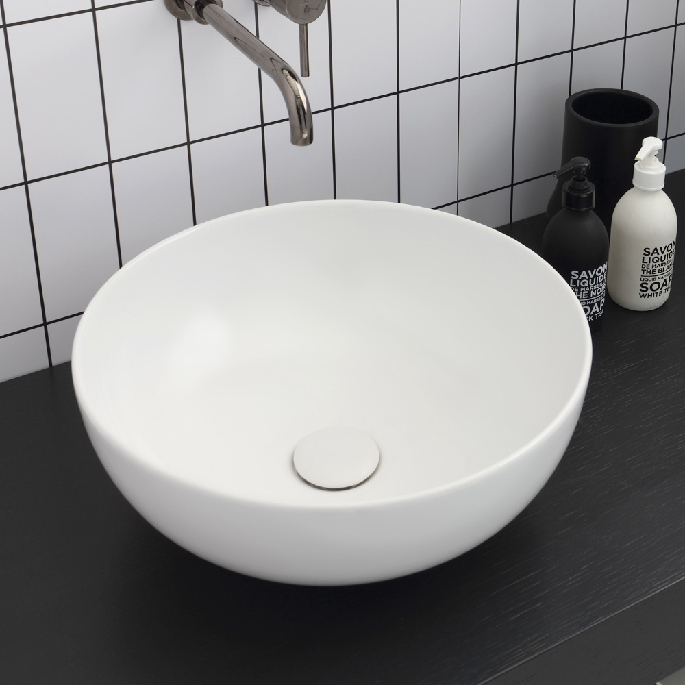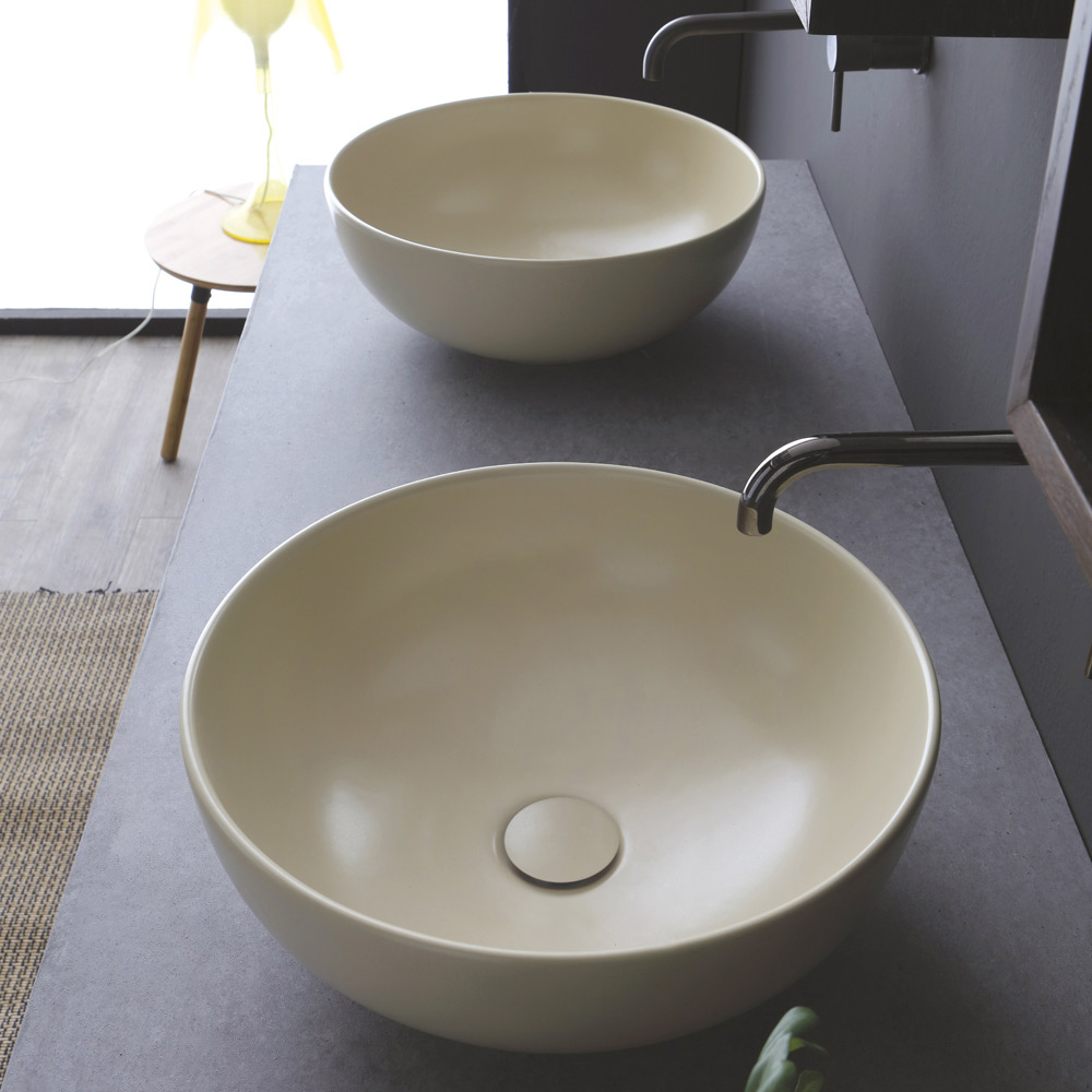 Round countertop washbasin made of colored ceramic with a matt finish through 100% Made in Italy craftsmanship . Simplicity and versatility come together to give life to this wonderful piece of furniture with a minimal and refined style designed to complete any modern bathroom area, bringing with it a touch of personality and elegance .