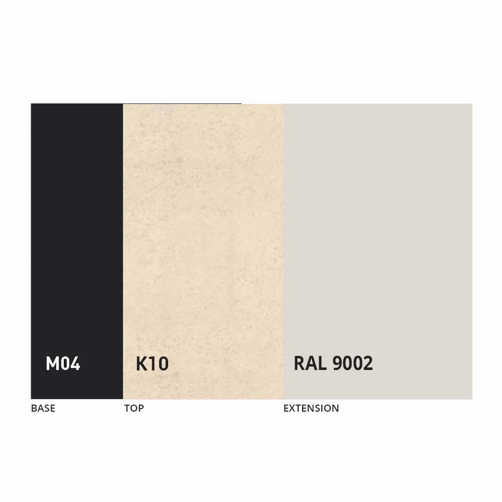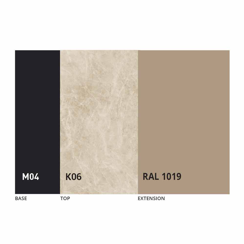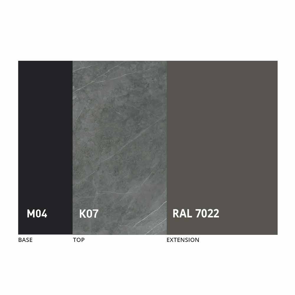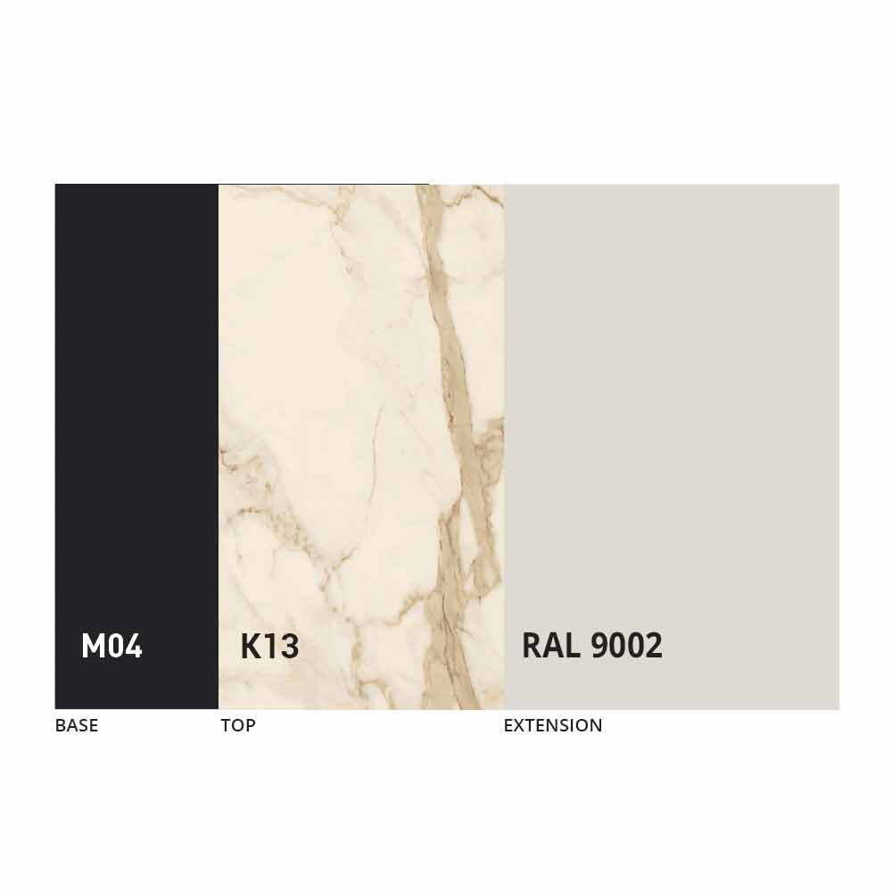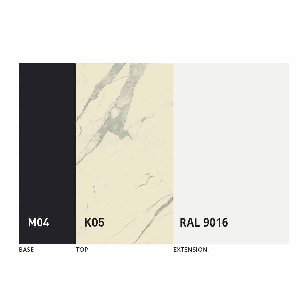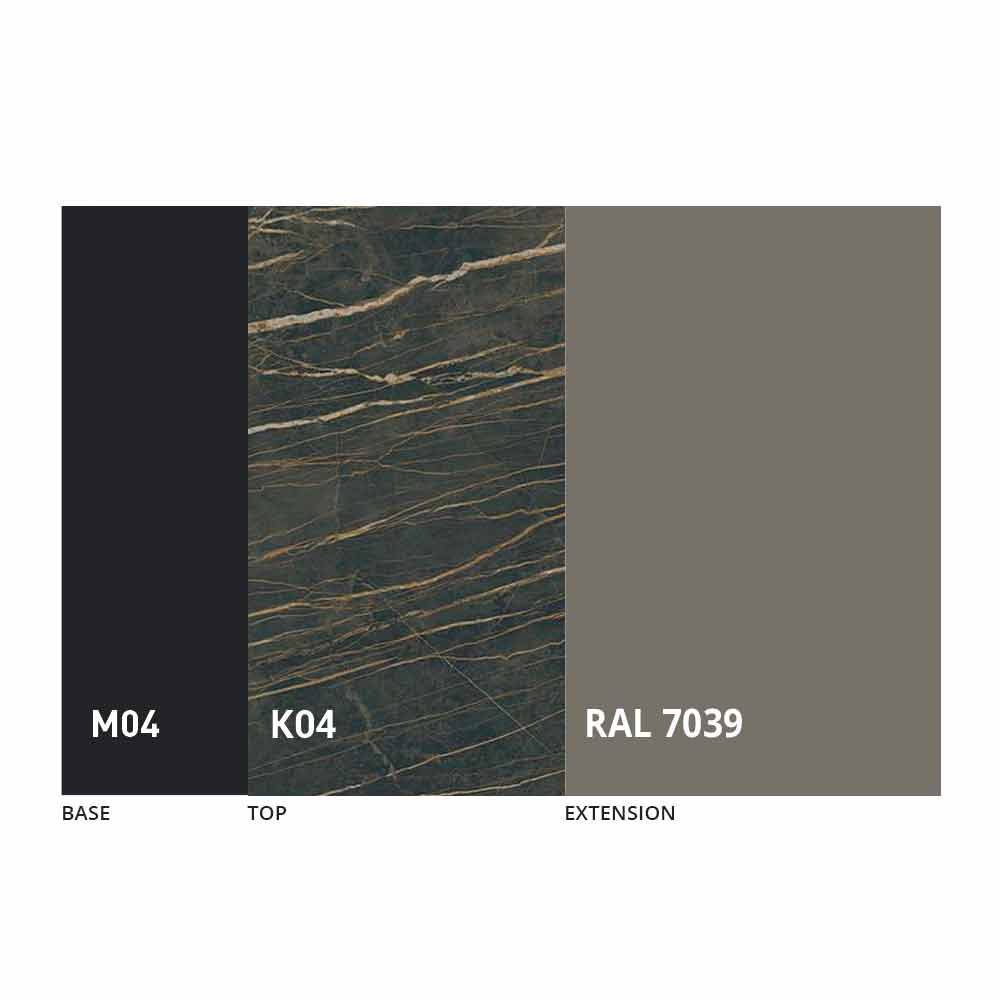 The top and base of the table can be customized with different materials and sample finishes or RAL lacquering. For information, contact us using the appropriate "