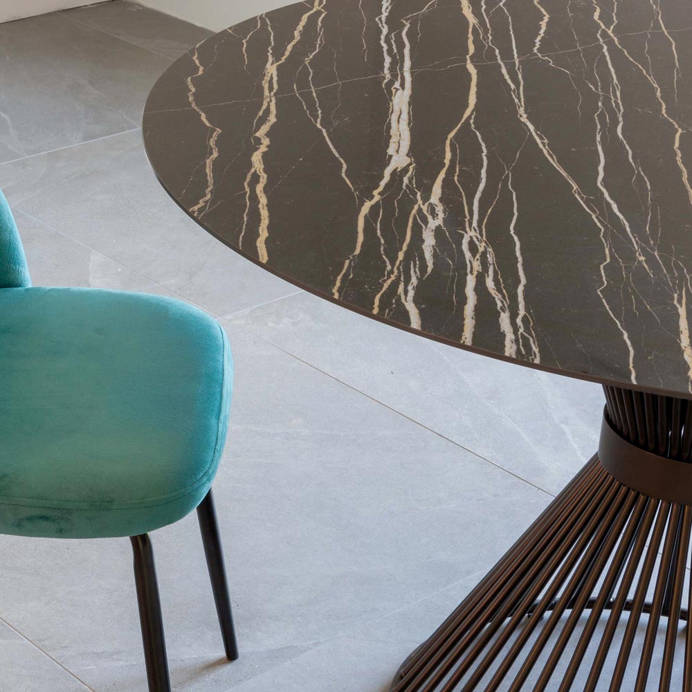 Round dining table made with florim glossy ceramic top (6 mm ceramic + 18 mm melamine) and base in black painted steel.