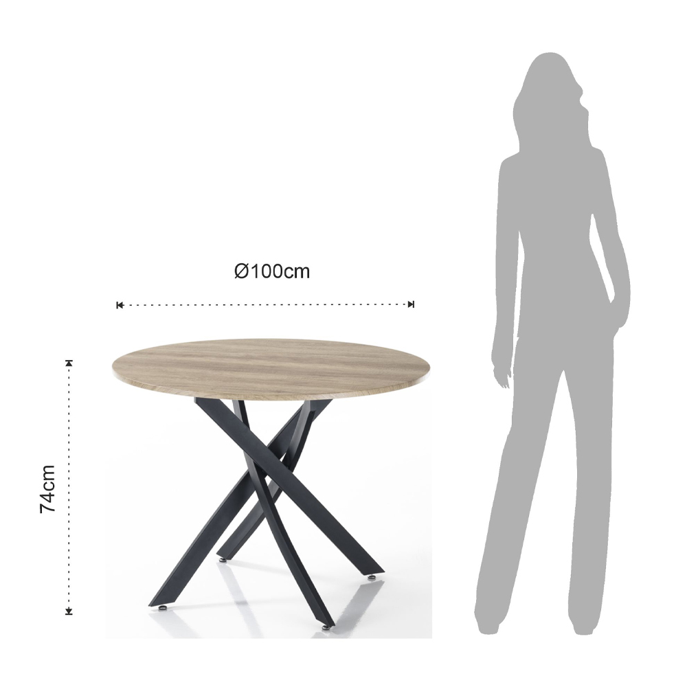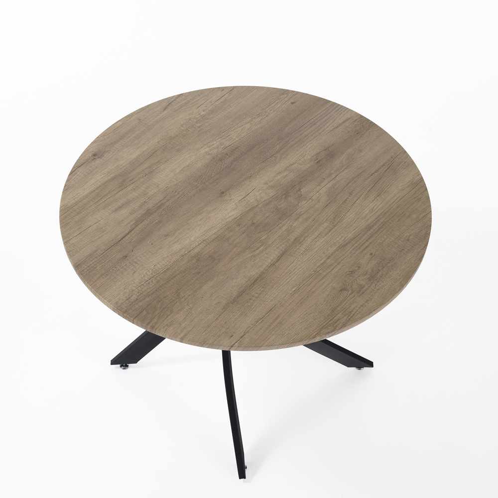 Indoor table with round top made of MDF covered in oak finish melamine th. 18 mm, base made of matt black painted steel. This product is the perfect idea for all those who want to give a touch of modernity and freshness to the room, be it a living room, a kitchen or a contract environment. The materials chosen for construction are top quality to guarantee the customer a table that is not only beautiful to look at but also functional and resistant .