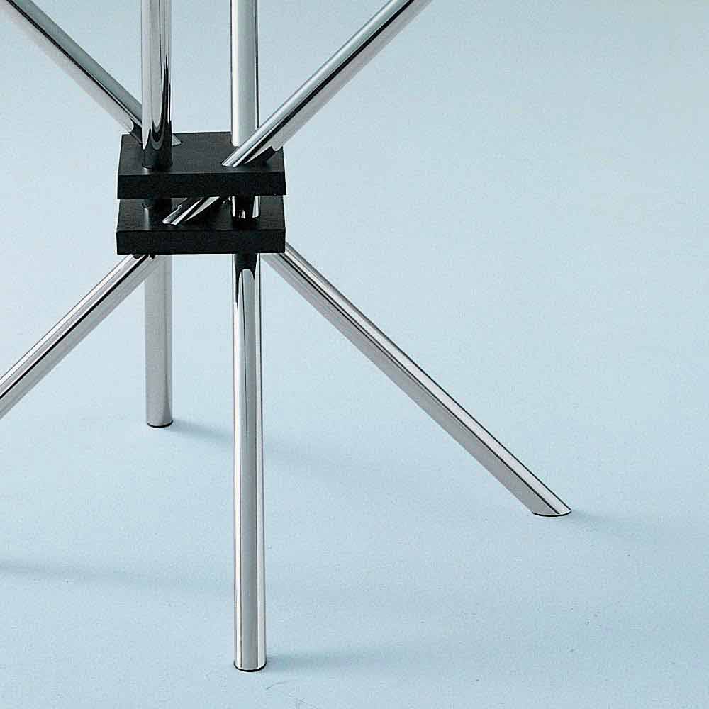 Dining table with round top in tempered glass (12 mm thick), base in chromed steel and joint in black painted cast aluminum.Simplicity and design are the peculiar characteristics of this modern furnishing accessory entirely made in Italy, conceived and designed to conquer the center of any dining room or kitchen with a contemporary style thanks to its versatile personality and its extreme essentiality . The glass top gives the product elegance and character while the steel base ensures a solid and durable product thanks to the use of quality materials . The result is a sober and elegant dining table capable of characterizing any stylistic situation with an exclusive and refined touch .