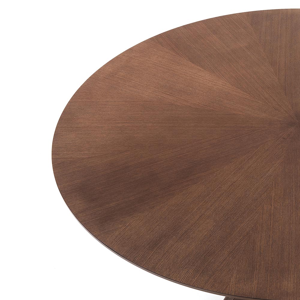 Round dining table with veneered MDF top (thickness 18 mm) and base made of matching solid wood . A product with an imposing and elegant style designed for those who love furnishing their home spaces with a refined and designer touch . The strong point of this table is undoubtedly represented by the particular shape of the base which, in addition to enriching the simple and minimal aesthetics , contributes to giving stability to the product for a quality result capable of gaining the center of attention within modern dining rooms or kitchens.