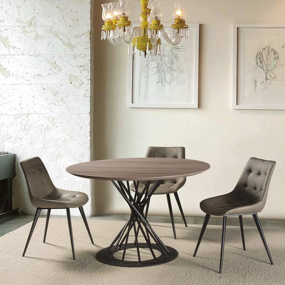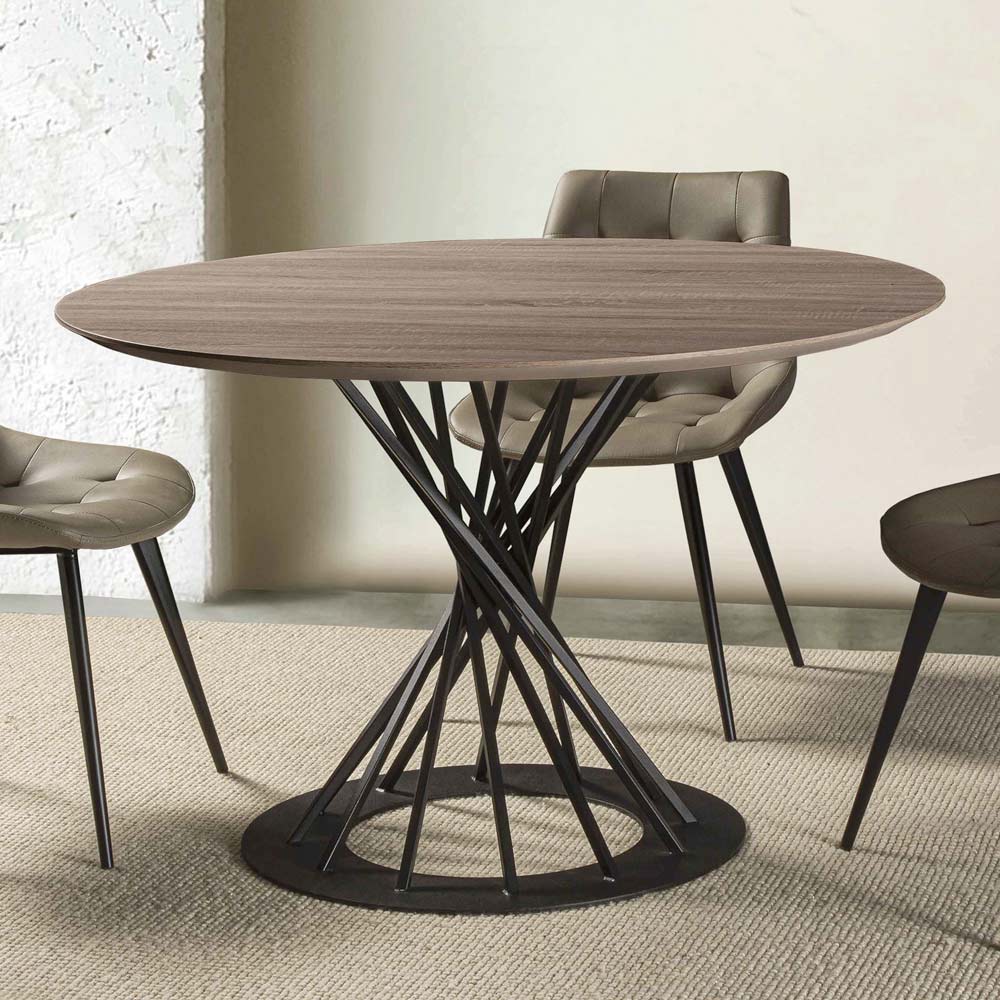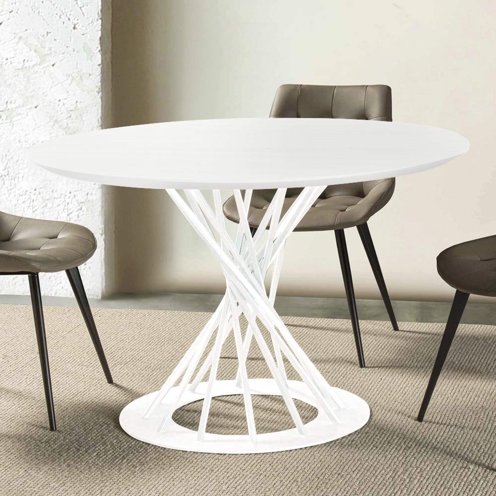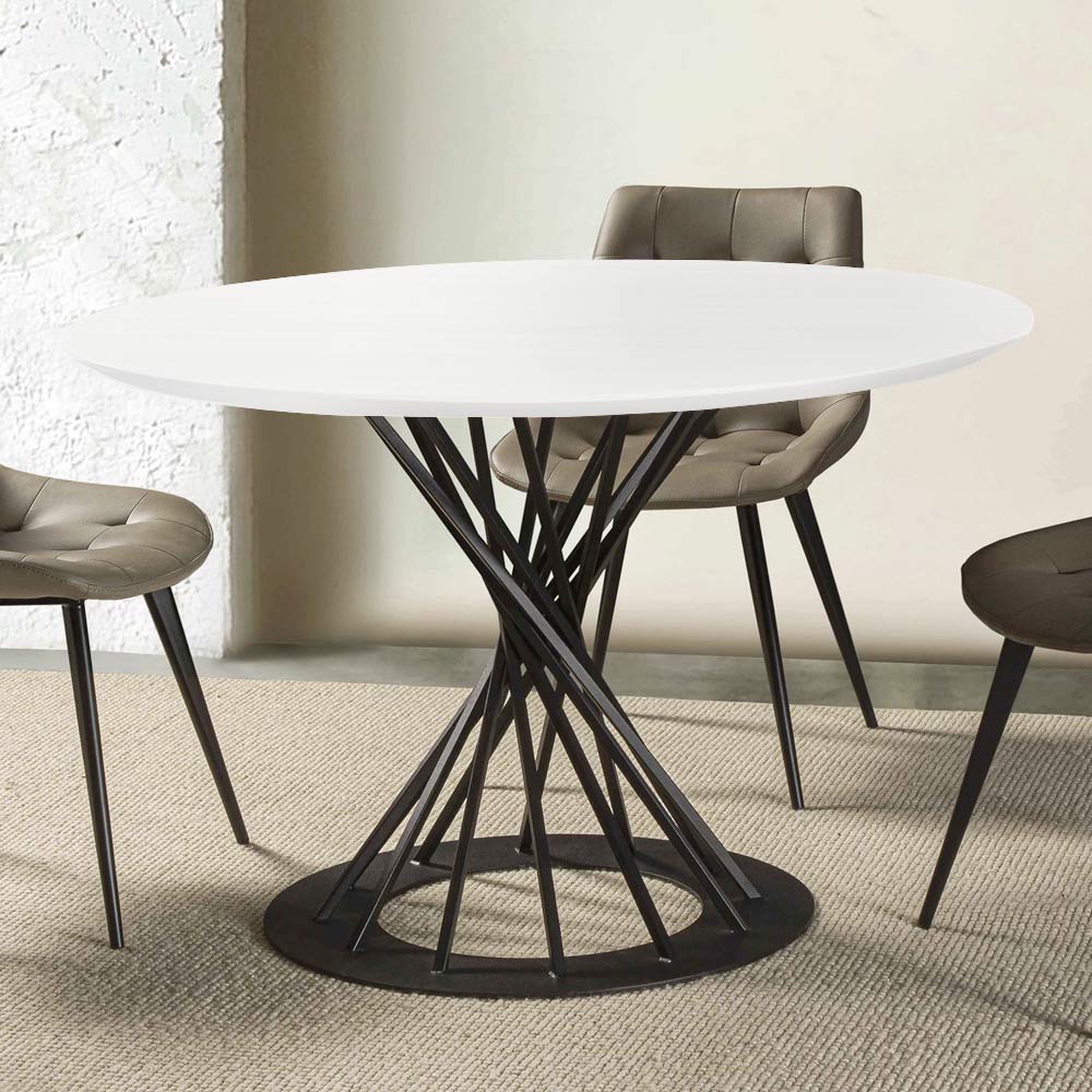Modern dining table with round laminated wood top (h 30 mm) with flared edge and base in painted steel . The wonderful combination of these two materials contributes to giving life to an elegant article characterized by contained dimensions that make it a perfect choice for those who have small spaces available but do not want to give up a modern article characterized by an innovative and avant-garde style . The particular structure of the base together with the choice of the round top give the product a splendid harmony between the shapes and a sense of movement which together with the available finishes make the table unique and with a strong contemporary character .