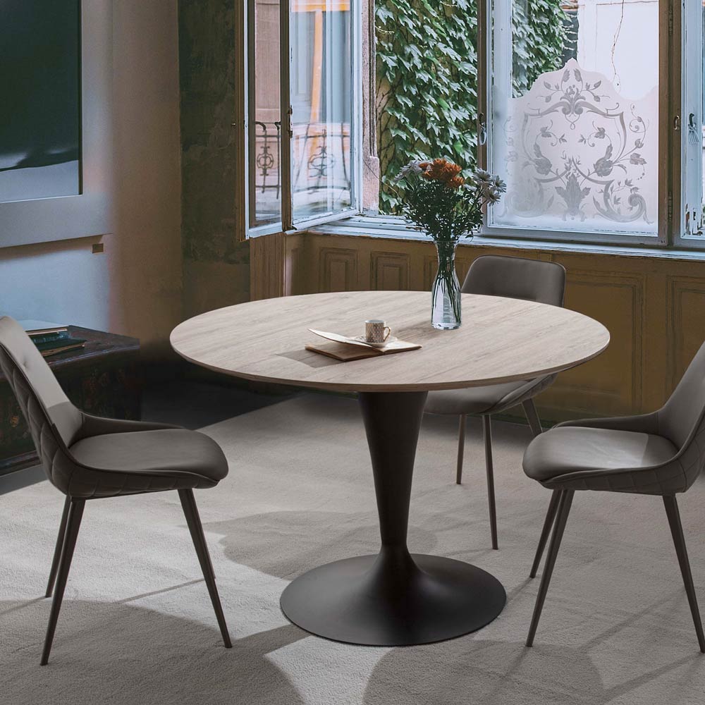 Wonderful dining table with round top in plated laminated wood (h 30 mm), textured oak finish with flared edge in mdf and base in black painted steel . Elegance and functionality are the keywords that best describe this modern piece of furniture that embodies an extremely contemporary look able to enrich the aesthetics of the room while maintaining rather small dimensions and therefore proving ideal for those who have limited spaces available but does not want to give up furnishing them in a sophisticated and classy way. Ideal for completing any environment with sobriety, this table is also extremely versatile , thanks to the perfect combination of simple and essential finishes.