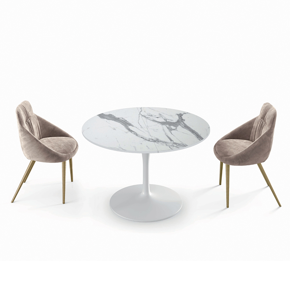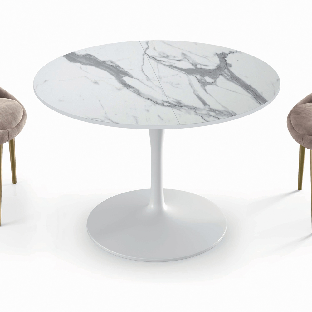 Extendable living room table with separate extensions to insert,laminate top with matt statuary finish,45° bevelled edge, base in glossy white lacquered cast aluminium. The product chain, from conception to production, up to quality control, is carried out entirely in Italy , in order to guarantee and preserve the typical characteristic of Italian "know-how" and the importance of typical Made in Italy. This product with a modern style has the primary objective of being able to be used daily without sacrificing design.