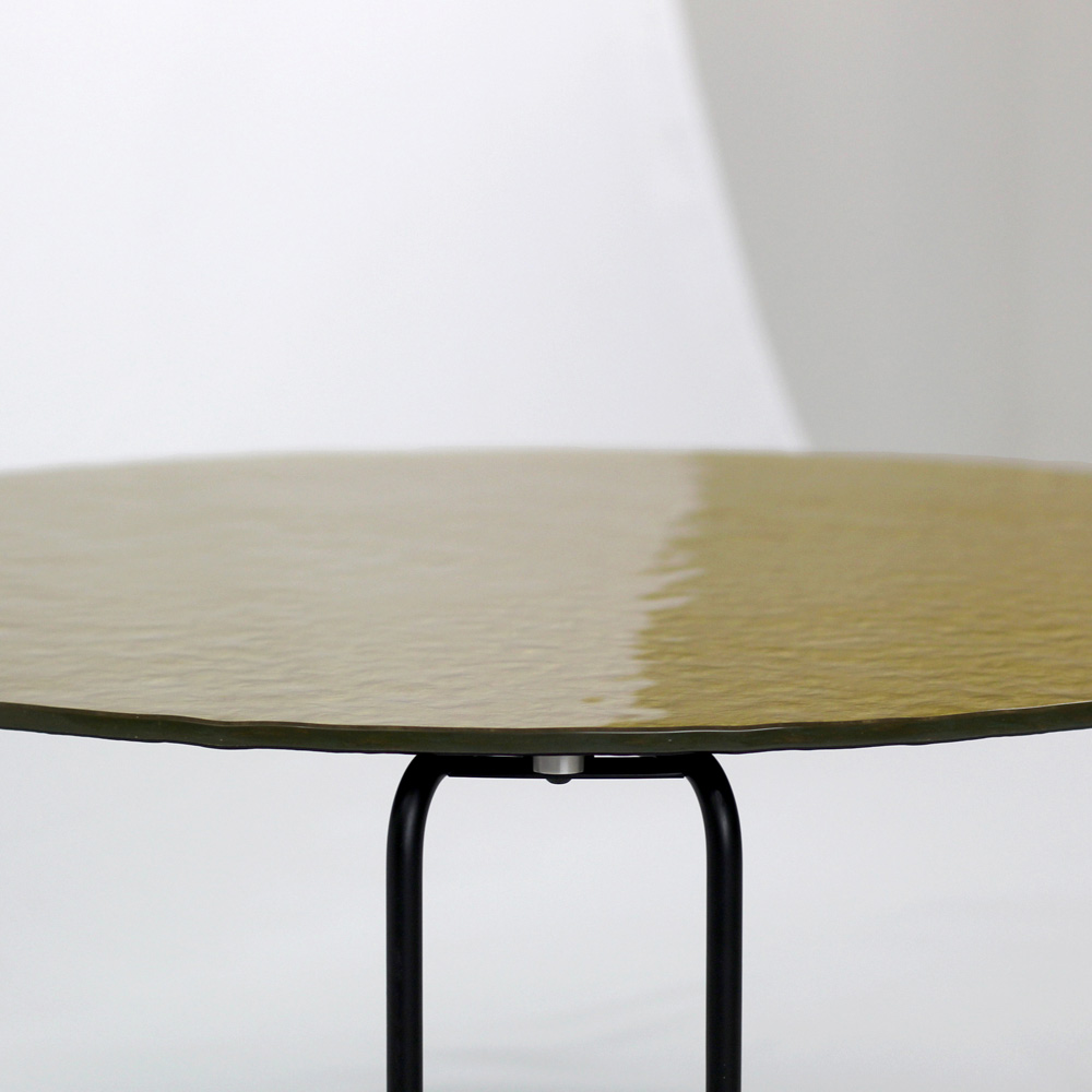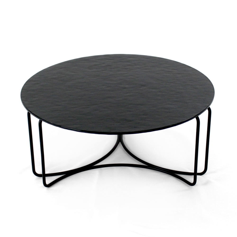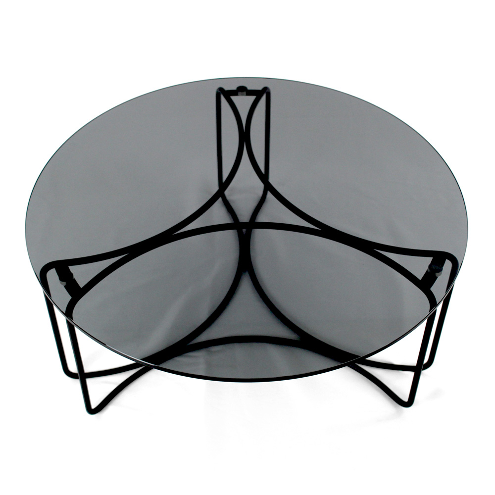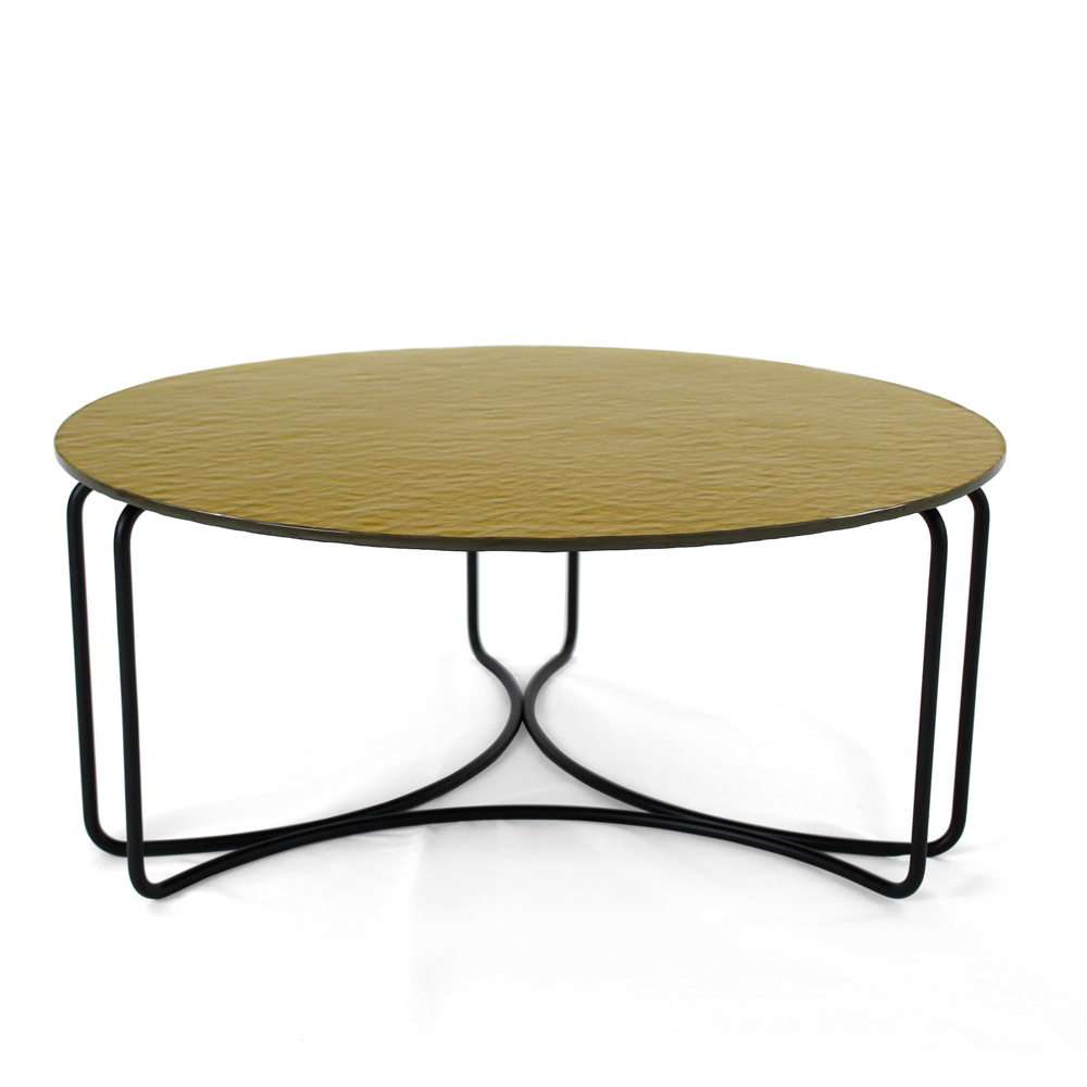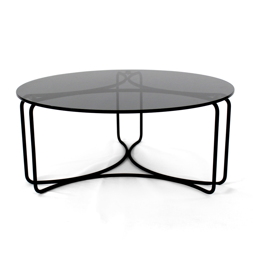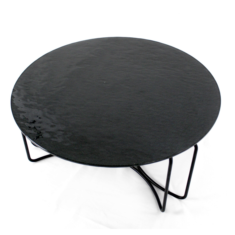 Round coffee table with painted steel base and glass top.