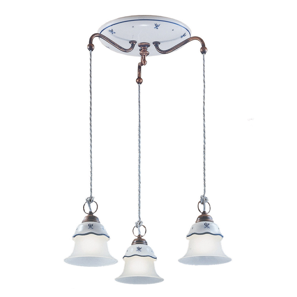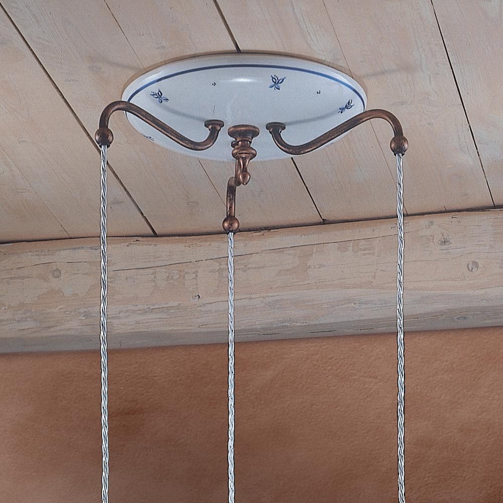 The 3-light pendant lamp with a round base is entirely made of iron and twisted cords with ceramic scallops with hand-painted decorations and etched glass bells that highlight the craftsmanship and dexterity of the craftsmen.