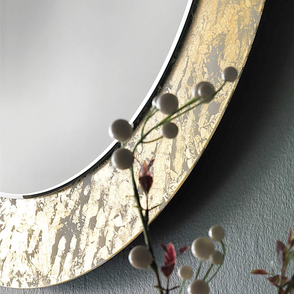 This round wall mirror stands out for its fine design use made with a leaf decorated glass frame in four different and elegant finishes. Ideal for creating luxurious and refined atmospheres, it adapts to different contexts to characterize the environment.