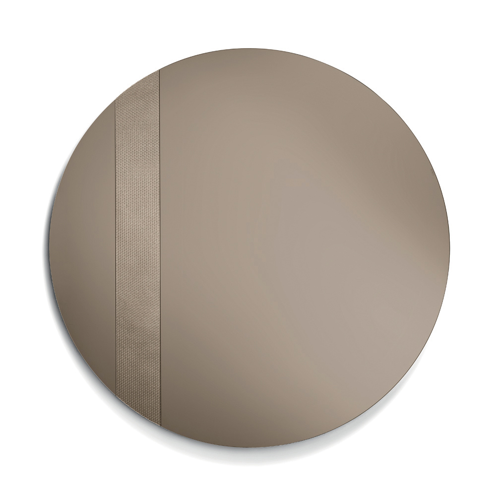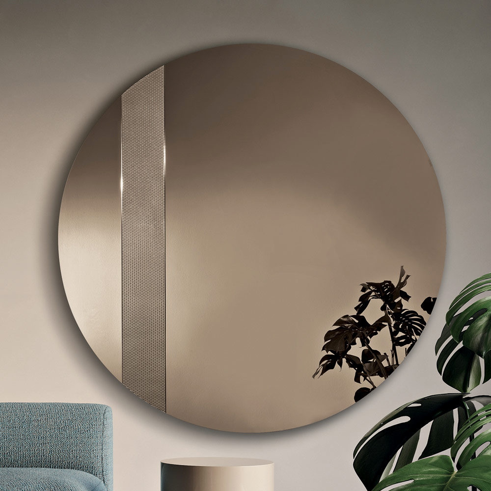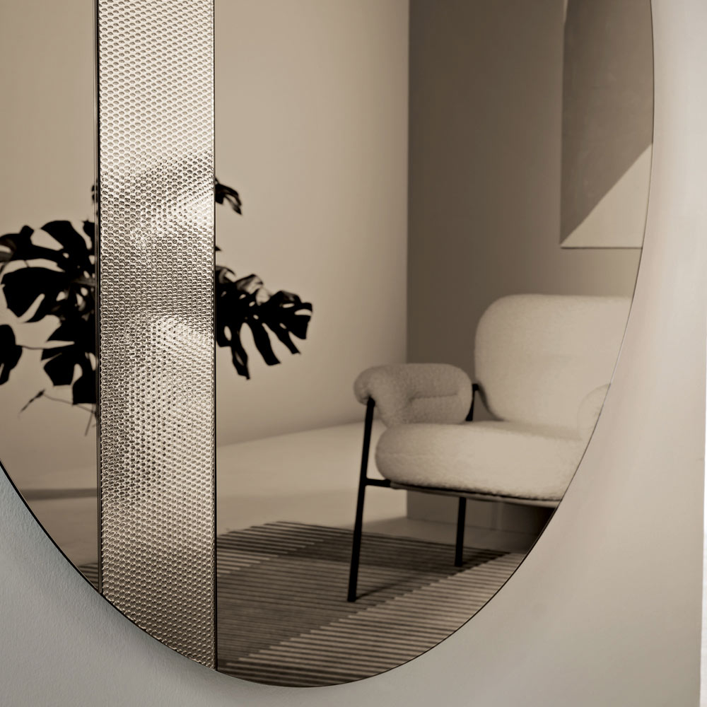 The mirror features a round shape embellished with a glass side insert with a tone-on-tone mesh decoration . This graphic detail captures the light and creates an elegant play of reflections, adding depth and movement to the reflective surface.