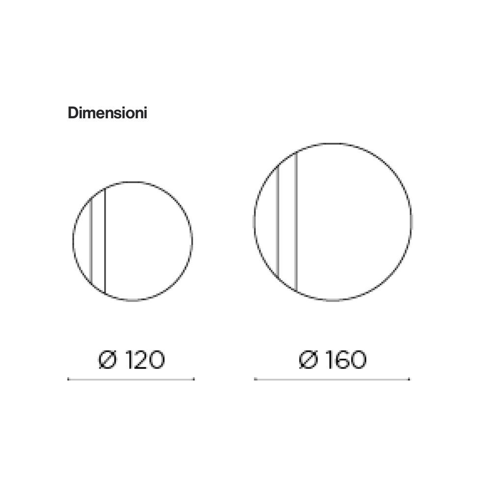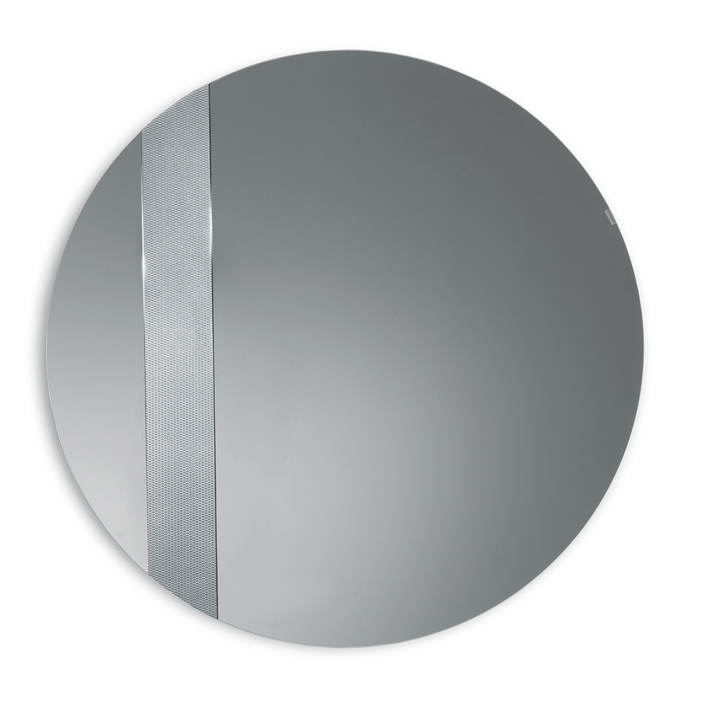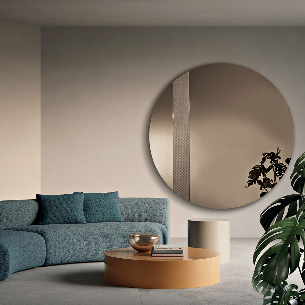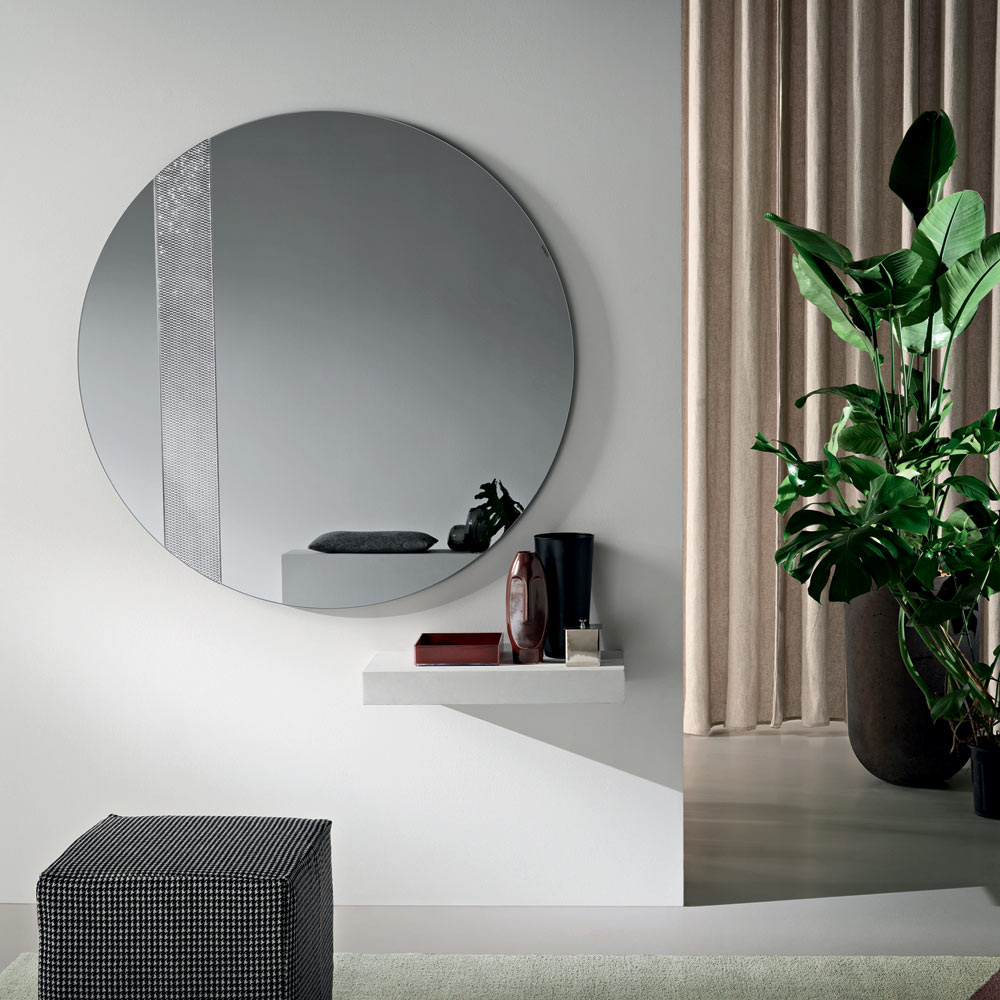 The mirror features a round shape embellished with a glass side insert with a tone-on-tone mesh decoration . This graphic detail captures the light and creates an elegant play of reflections, adding depth and movement to the reflective surface.