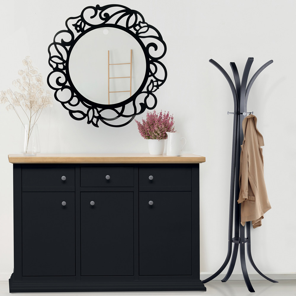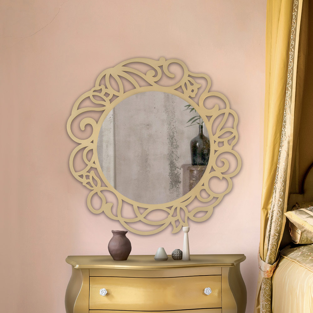 Round mirror with perforated decoration with wood pulp and wood frames entirely Made in Italy. Refinement and elegance come together to give life to this product with a great visual impact that makes every environment unique and special. The Italian artisans put a lot of care and attention into making it, guaranteeing all the quality of Made in Italy.