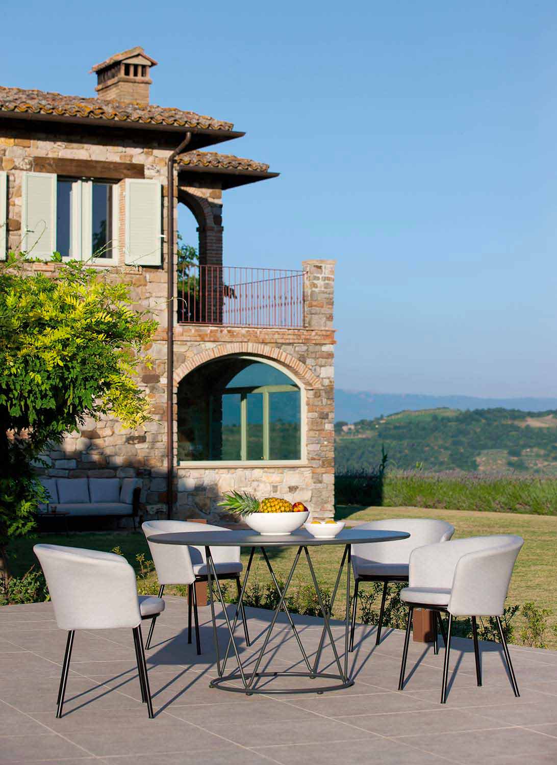 Round outdoor table with powder-coated galvanized iron structure painted with thermosetting powders perfect for giving the product solidity and resistance to all weather conditions while always maintaining vivid colors and finishes. Characterized by an innovative and refined design, it is the perfect element to give any environment character and at the same time modernity without ever neglecting the functional and practical aspect. Ideal for furnishing private environments such as gardens but also bars and restaurants.