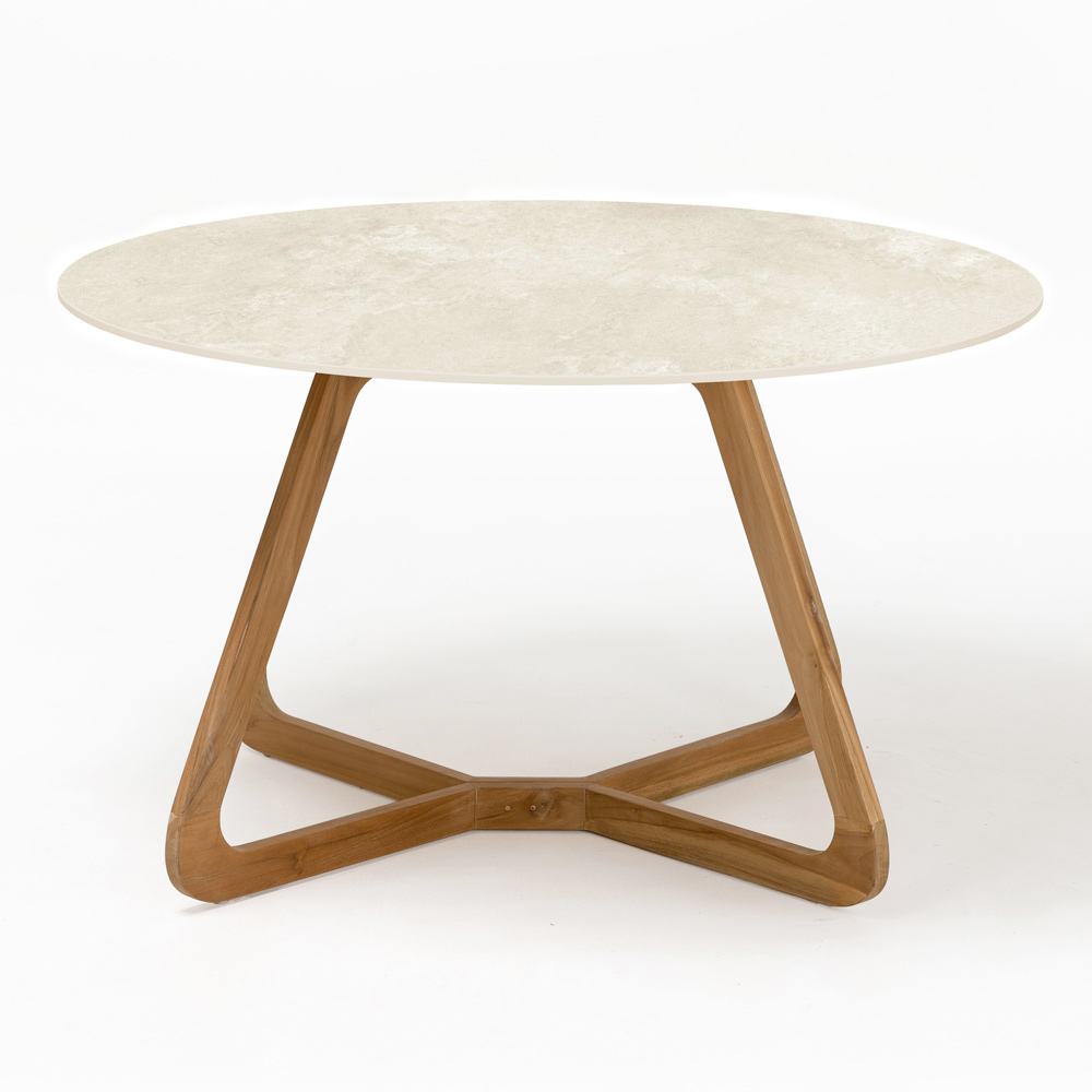 Outdoor table made with a solid natural teak wood base (35 mm thick), infinity stoneware ceramic top (12 mm thick) with a matt Chianca di Ostuni finish and a subframe in Okumé marine plywood , entirely Made in Italy.