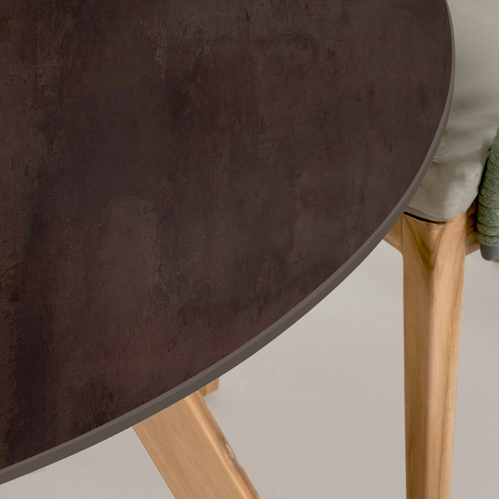 Made in Italy. This outdoor table is a designer piece inspired by the industrial aesthetic and rustic charm of Corten metal ceramic. It combines a wooden base with a ceramic top that mimics the color and texture of Corten metal, known for its distinctive rusty appearance that blends perfectly with natural and modern outdoor settings.