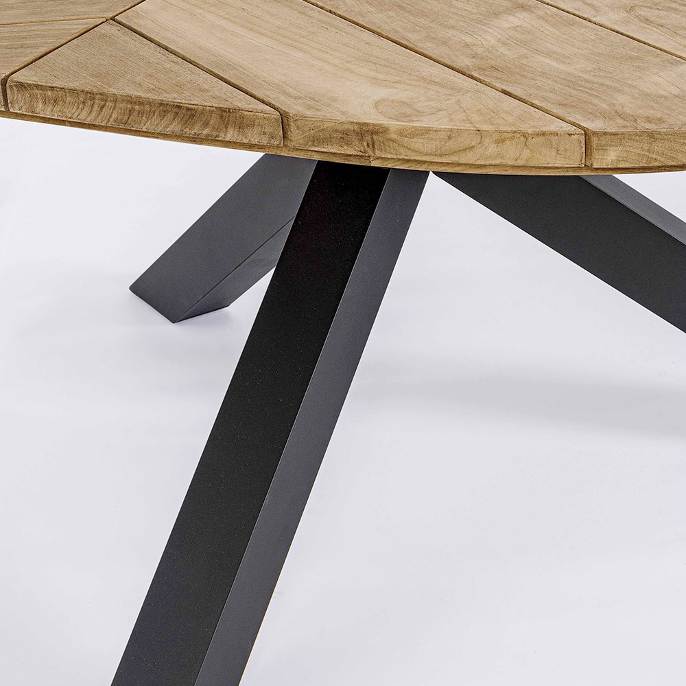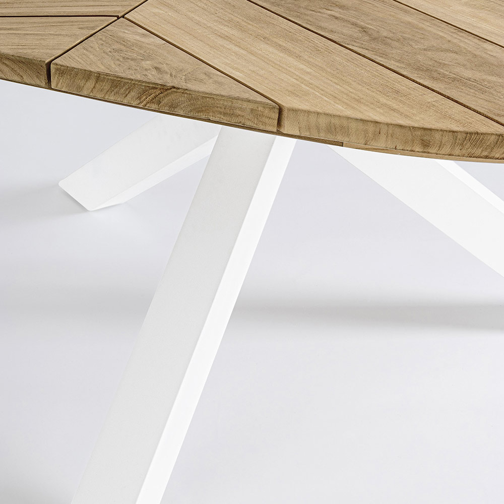Round outdoor dining table in aluminum with top in quality teak wood.