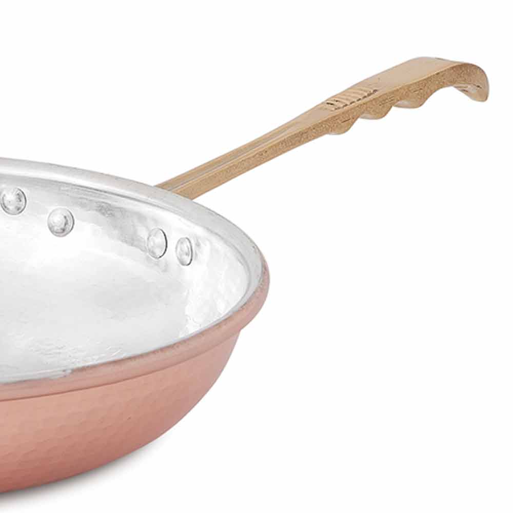 This pan entirely created in solid copper hammered and tinned by hand over the fire is ideal for frying, pancakes, sautéing pasta or glazing vegetables.