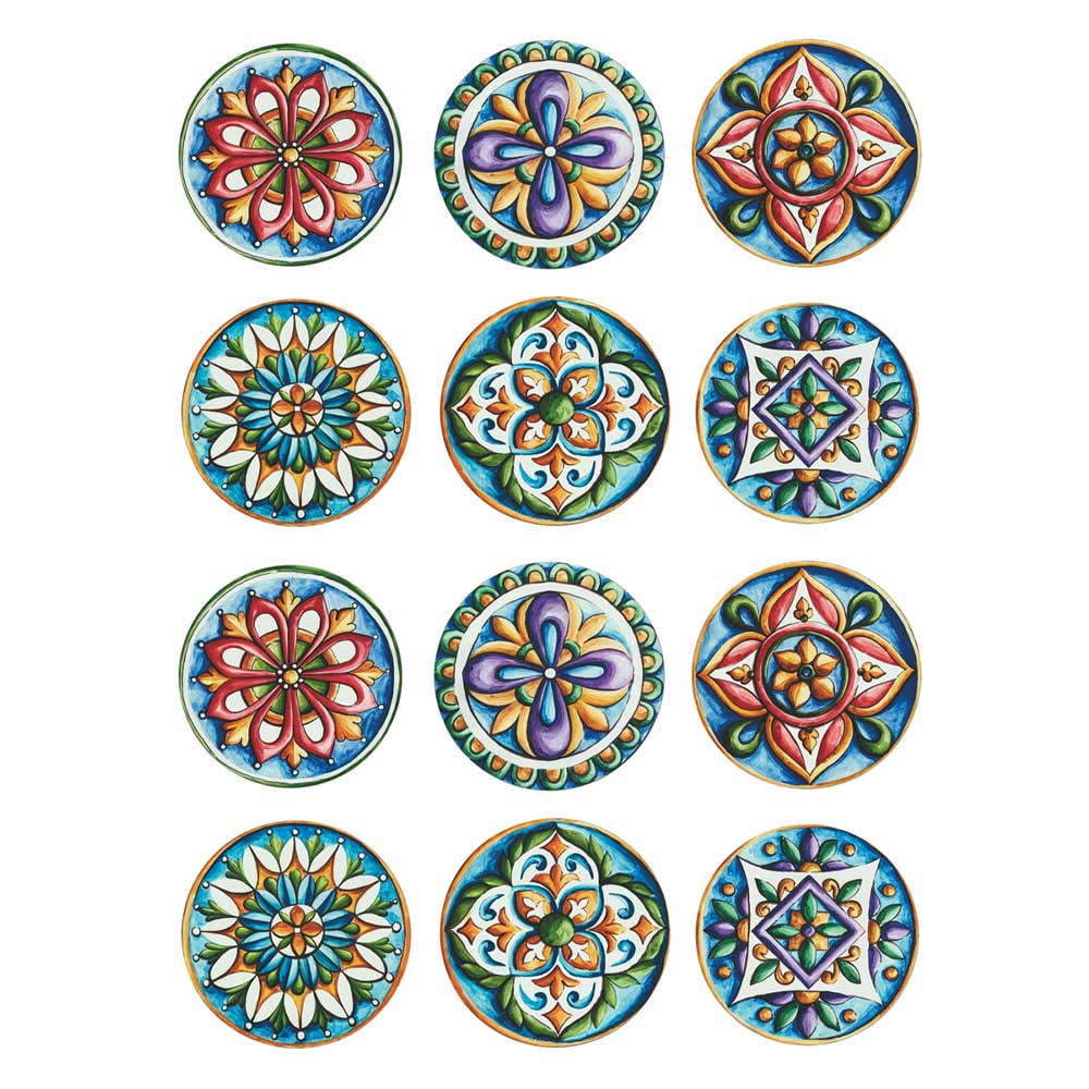 Round colorful plastic placemats with majolica design, 12 pieces.