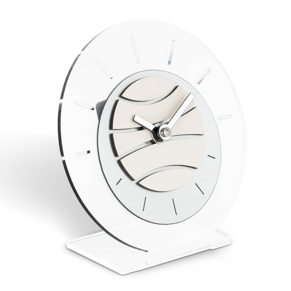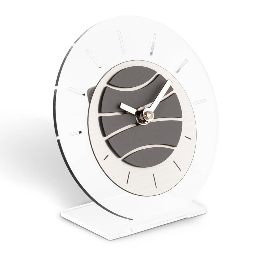 This table clock is a masterpiece of modern design and innovation . With its stable base and circular dial, it evokes a sensation of time in suspension . The hands move gracefully on a dial that plays on the alternation of empty and full, offering a dynamic and unique visual experience.