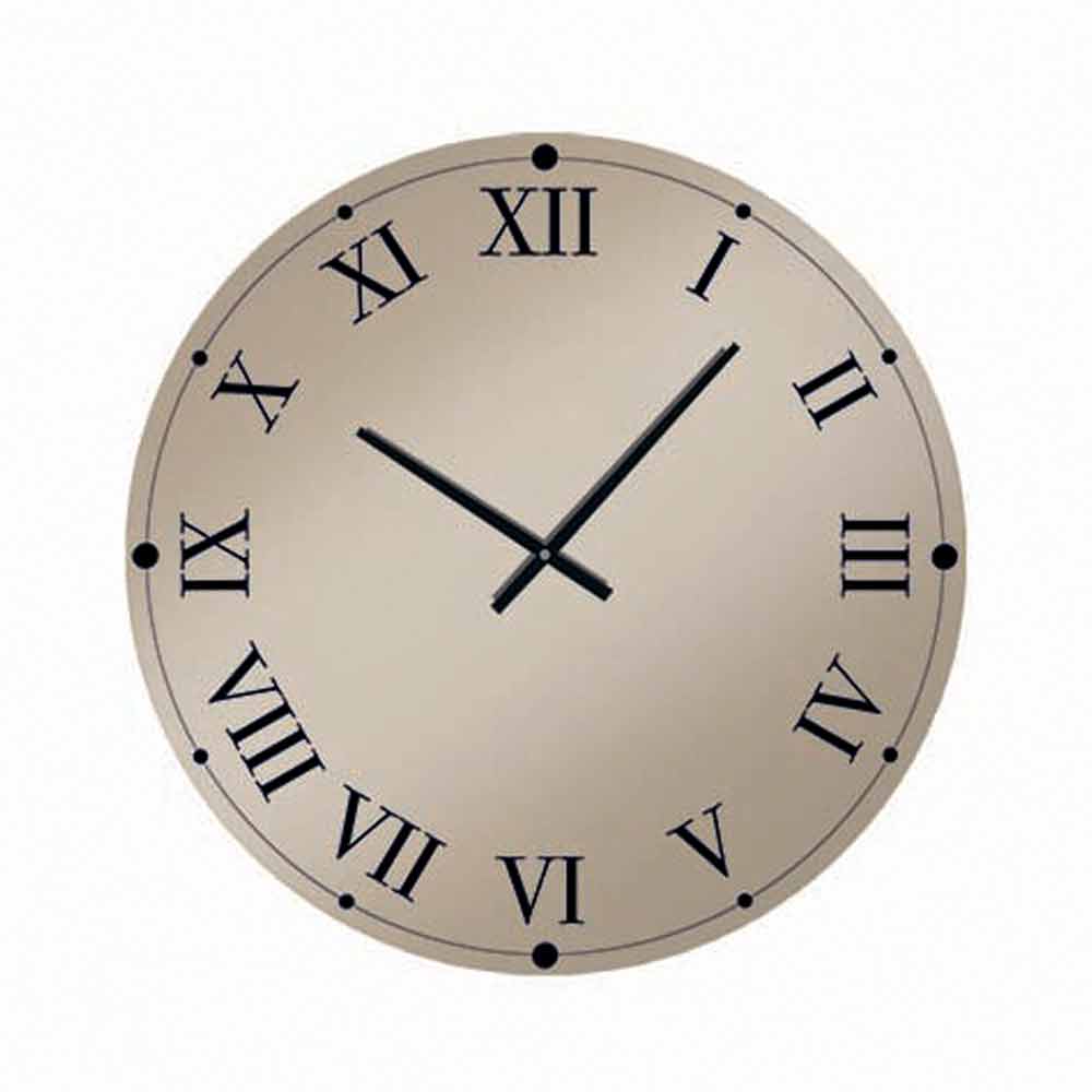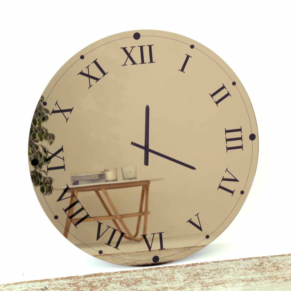 Round wall clockMade in Italy made of mirroredcrystal glass with Roman numerals and black hands. The use of the mirrored finish makes this furnishing accessory the perfect fusion between a mirror and a real clock, performing an extremely useful function and at the same time acting as a wonderful light point, helping to optically enlarge the spaces. Its design is characterized by elegance and essentiality , characteristics from which a classy article is born, ideal for the most varied modern environments, giving a personal and creativetouch to the furniture and increasing its aesthetic value.