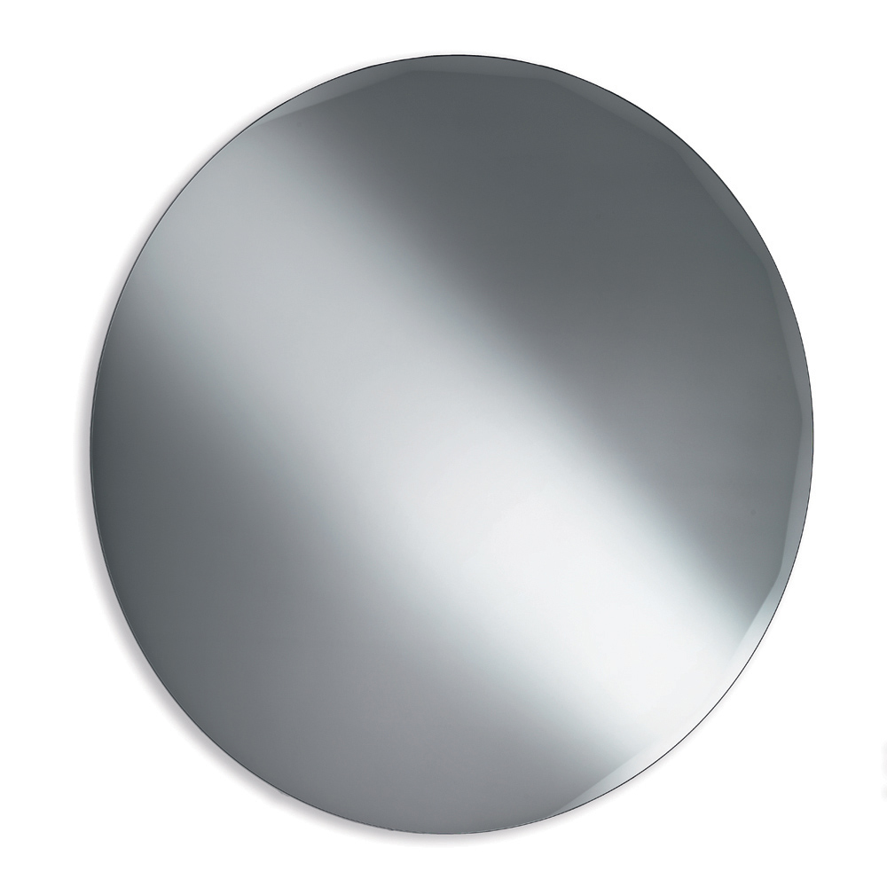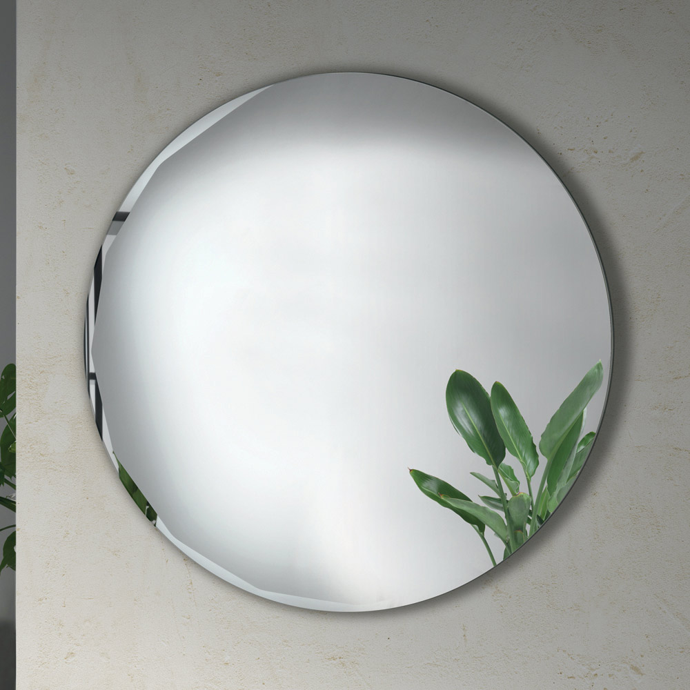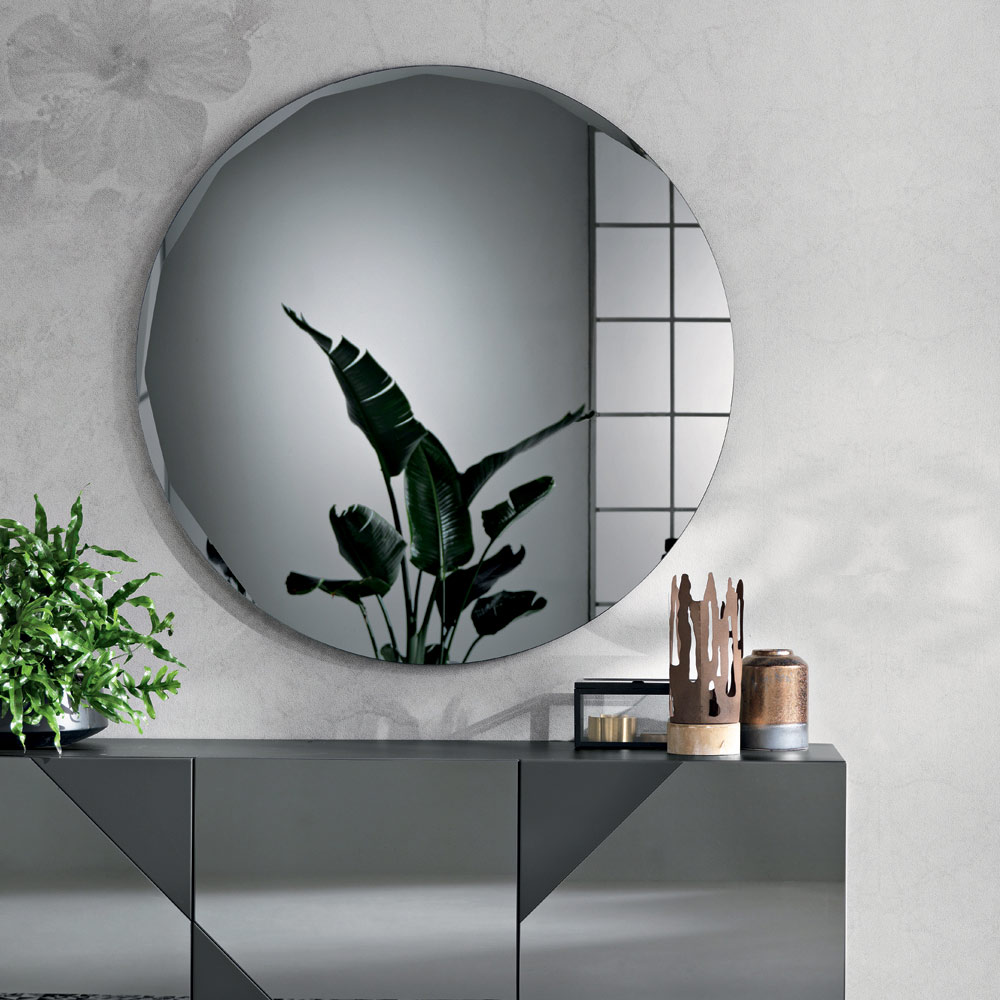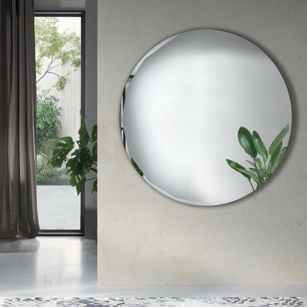 The mirror features a pure round shape embellished with a refined lateral bevel that enhances its profile and enhances the minimalist design. This detail creates a delicate play of reflections along the edge, lending depth and luminosity to the surface.