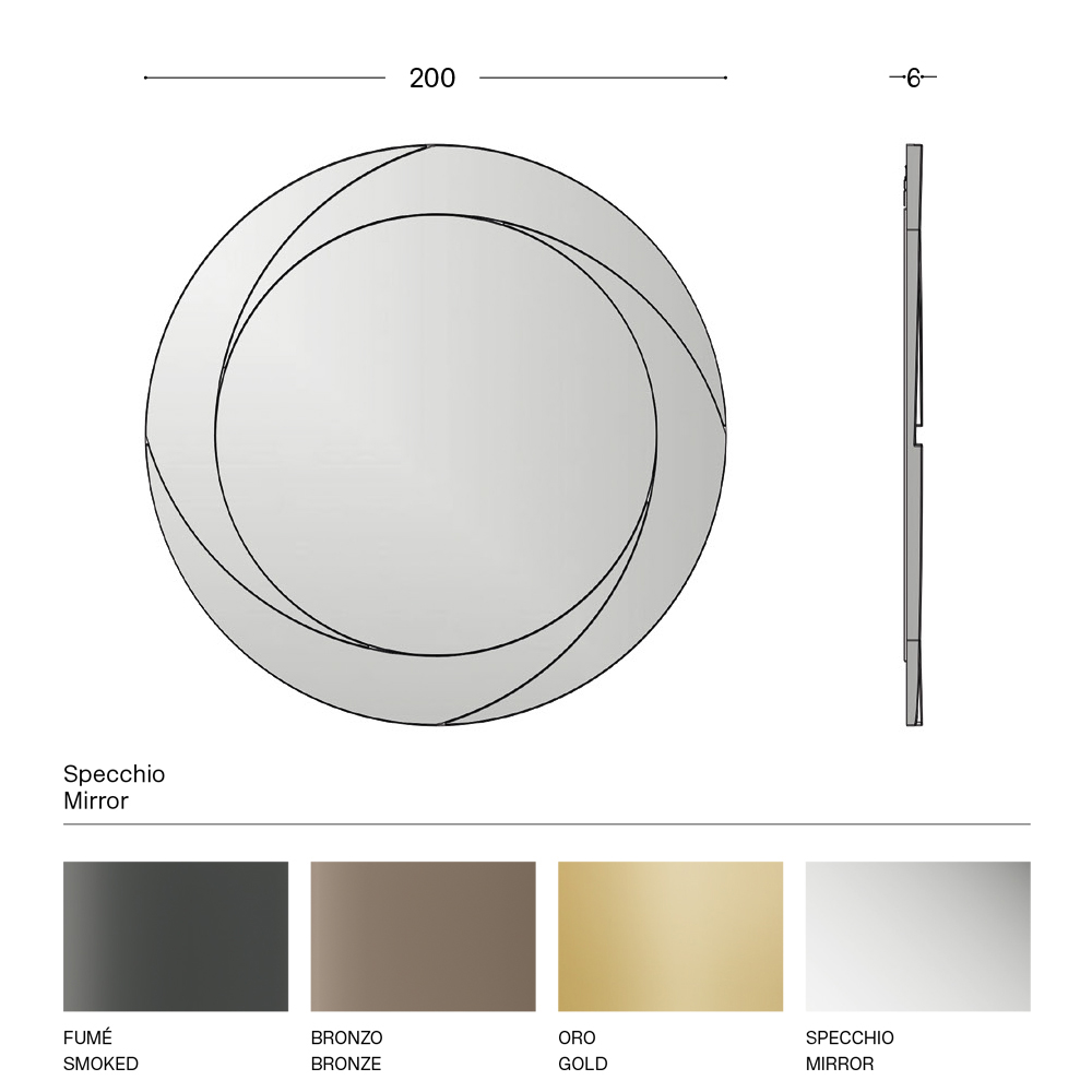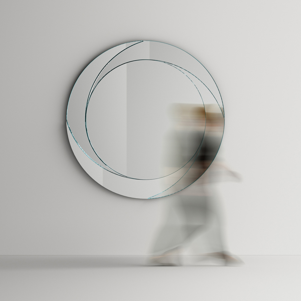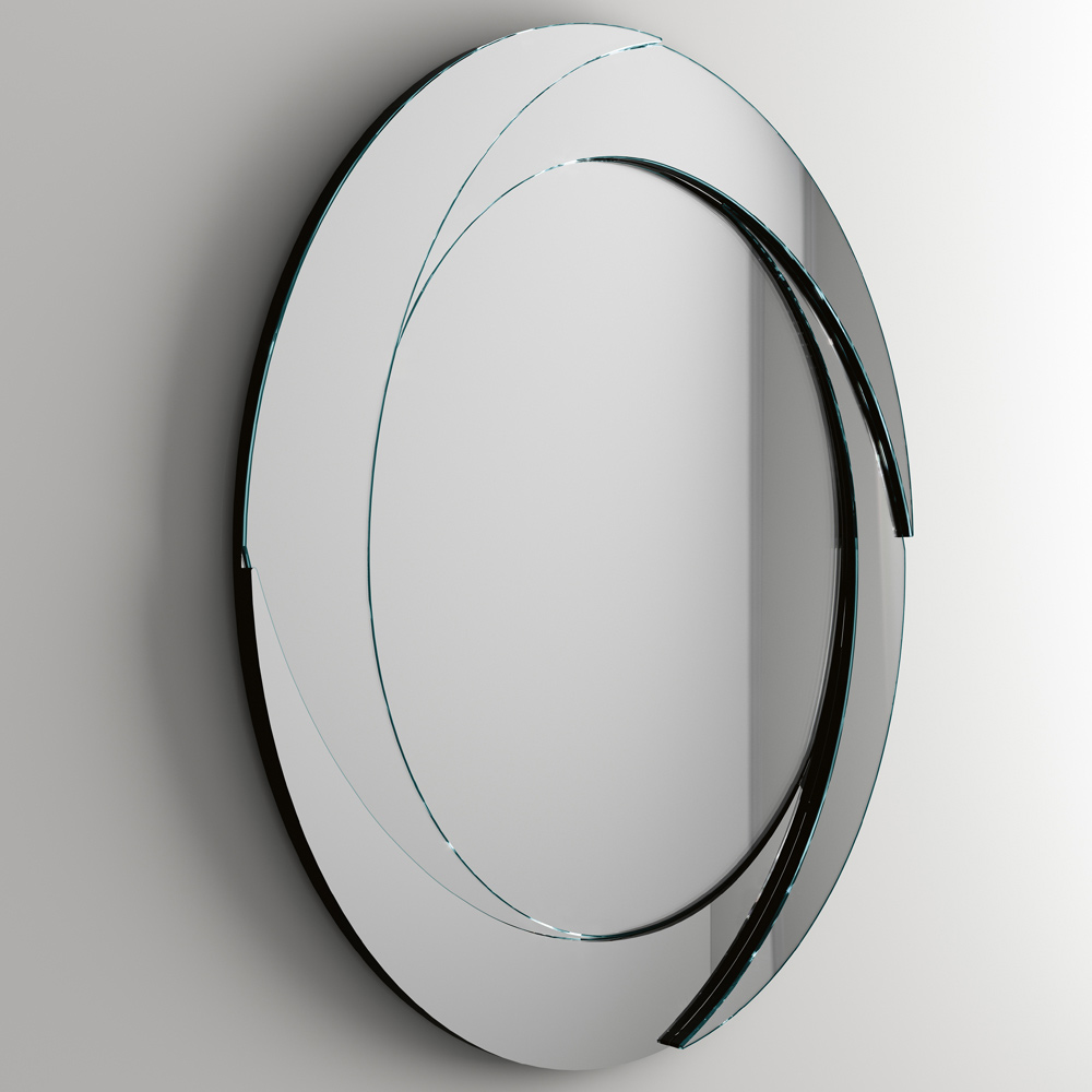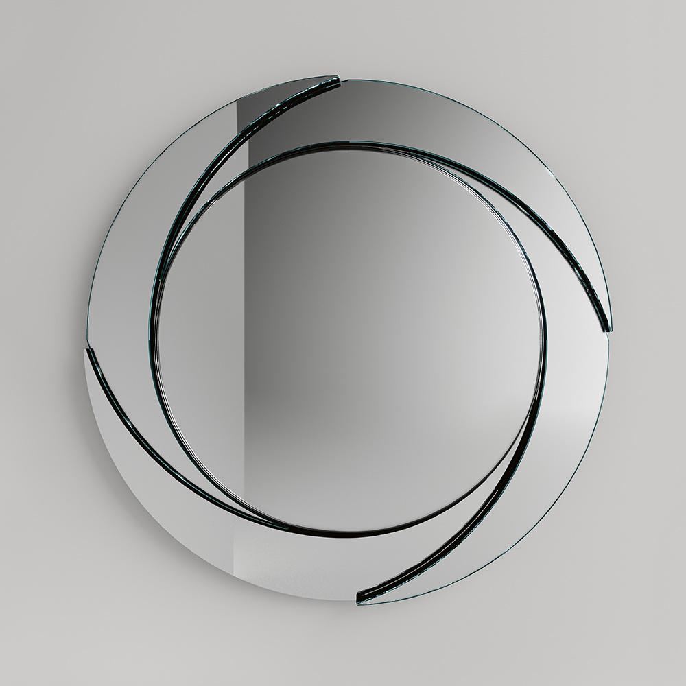 Wall mirror with black painted wooden structure , round central part and inclined external frame with embossed decoration . A piece of furniture that represents the minimal graphic image of the vortex thanks to the inclination of the four external elements which create a game of perspectives capable of making the image reflected on the central mirror dynamic. Its simple but impactful aesthetic is ideal for completing the walls of any area of the house, from the entrance to the living room to the bedroom, while at the same time helping to optically enlarge the spaces for a larger and brighter environment.