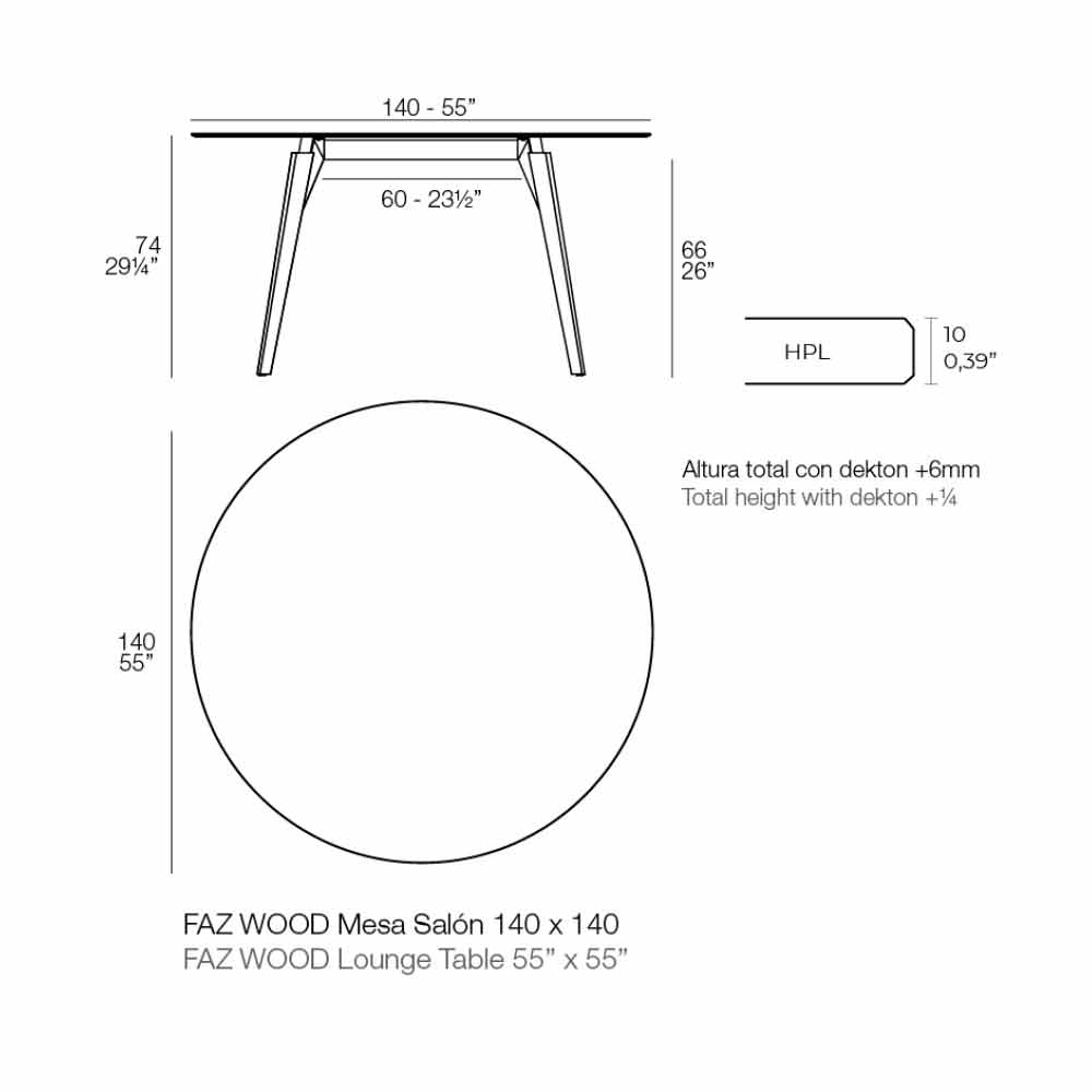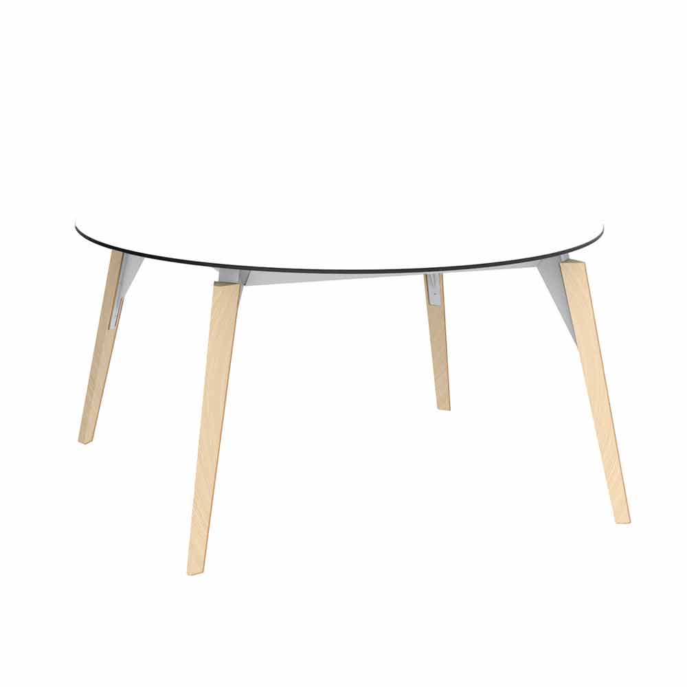 Round coffee table with legs in light or dark ash wood and hpl top in various finishes, 2 sizes.