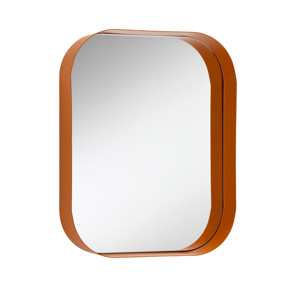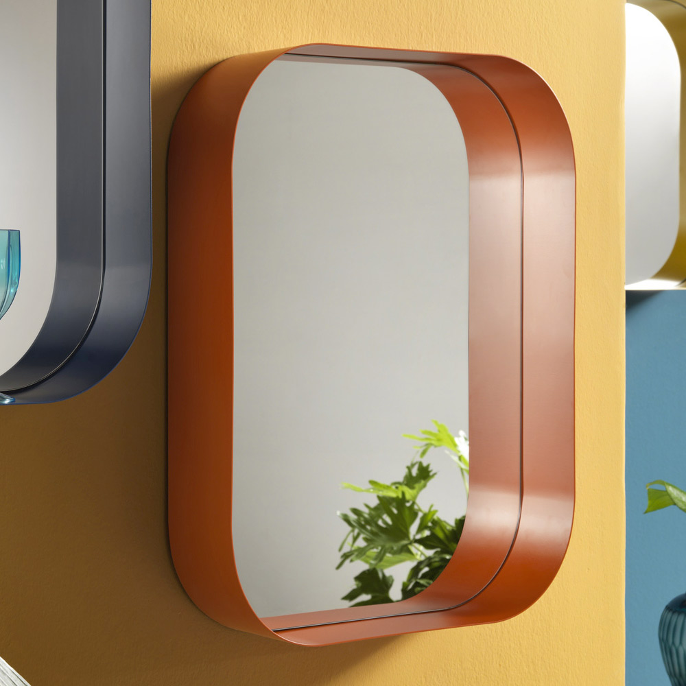 This large and nice wall mirror with a rectangular design with rounded corners is characterized by the metal edge that frames the mirror and acts as a practical and colorful 12.50 cm shelf.