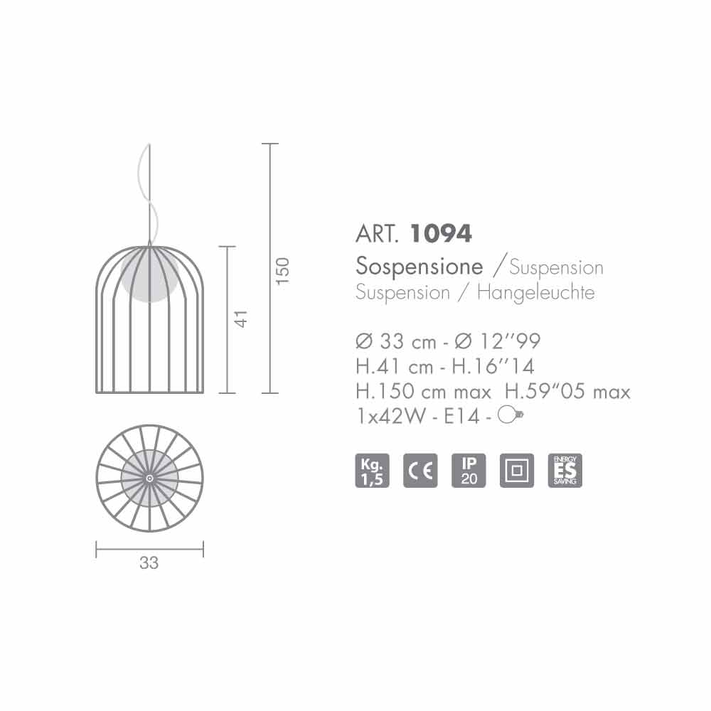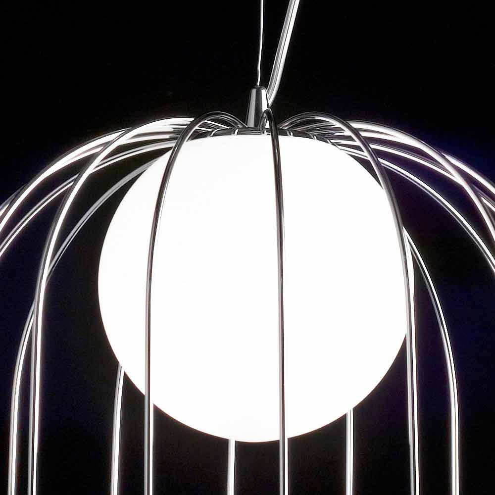 Collection of three suspensions and three table lamps, which can reach a considerable size, composed by a metal cage and a milky white blown glass ball.