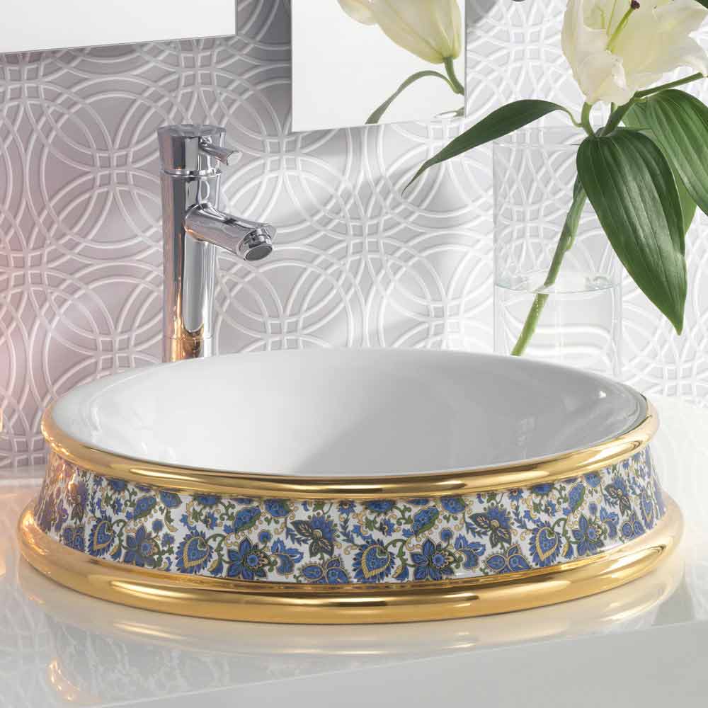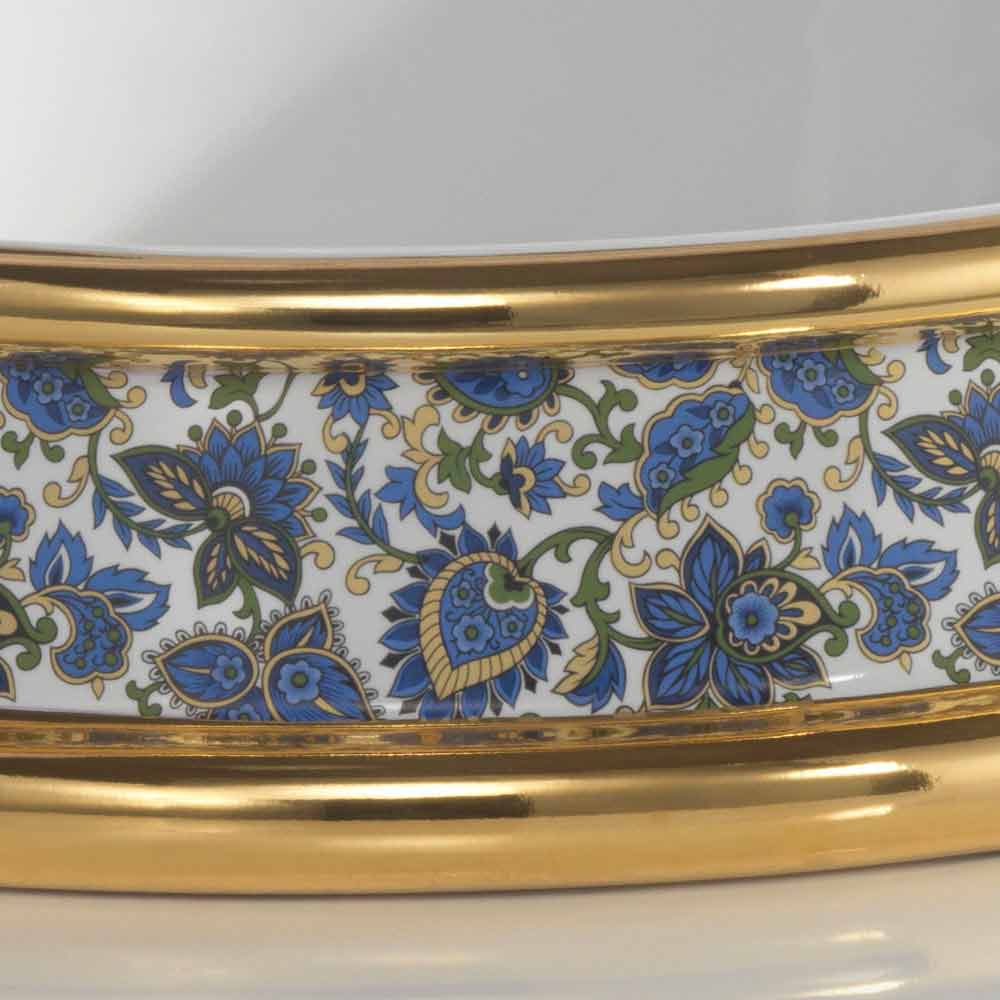 Semi-recessed washbasin in fire clay and gold handmade in Italy, Manilo Semi-recessed bathroom sink made in Italy in handmade fire clay with blue and gold floral decoration band and 24 carat gold painted rings.