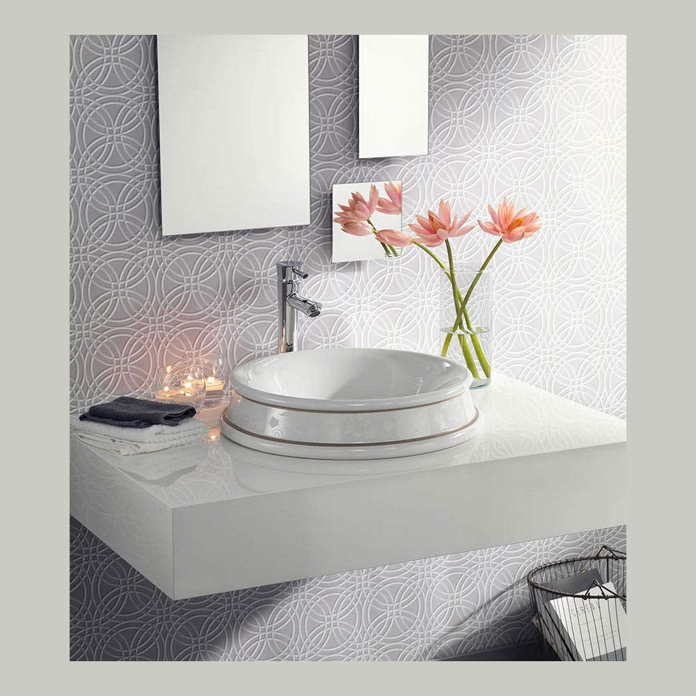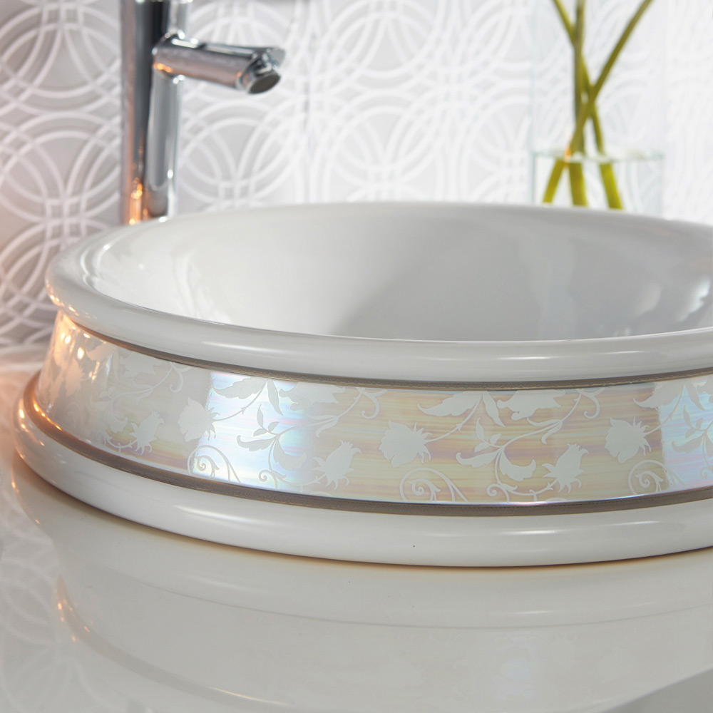 Semi-recessed bathroom sink made of fire clay with ton sur ton embroidered lace , entirely Made in Italy. The shape and finish of this product were designed to decorate the bathroom with elegant and impressive furniture, one of a kind. The quality and functionality typical of a Made in Italy product have not been overlooked by choosing the best materials and entrusting the production to expert Italian craftsmen.
