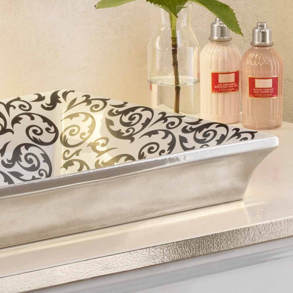 Modern semi-recessed bathroom sink in fire clay handmade in Italy, Guido Semi-recessed bathroom sink made in Italy in fire clay with handmade ornamental floral decorations inside and finished in platinum on the outside.