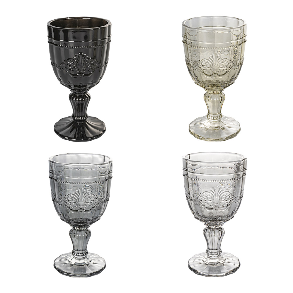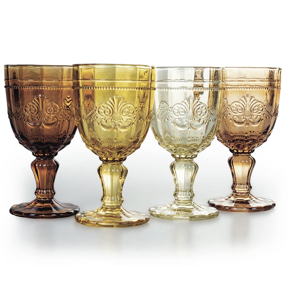Discover the refined beauty of this set of 12 glasses , each a masterpiece of design and color . These glasses are a dance of dreamy shades. Each piece boasts a finely detailed floral ornament that evokes the elegance of a hidden garden. The worked edge adds an extra level of detail, making them perfect for special occasions or to add a touch of everyday luxury . These glasses are not just containers for your favorite drinks, but true works of art for your table.