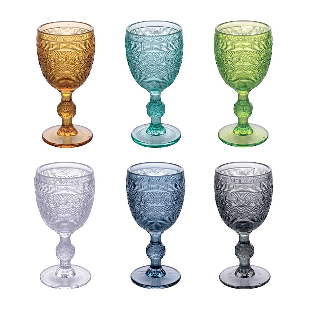 This set of 12 glasses is a triumph of color and classic ornamentation . With shades ranging from warm gold to vibrant green , and from transparent ice to midnight blue , each piece reflects a unique and timeless beauty. The design worked with geometric motifs and sophisticated symmetries adds a sense of ancient splendor, perfect for a table set with style and refinement . These glasses are not simply containers for drinks, but real objects of art , ideal for celebrating special occasions or for enjoying a touch of luxury on a daily basis.