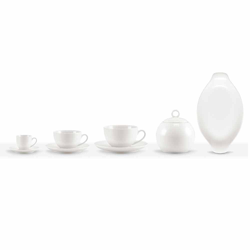 Service of coffee cups, tea, breakfast with sugar bowl and saucer with a modern design in white porcelain, 20 pieces.