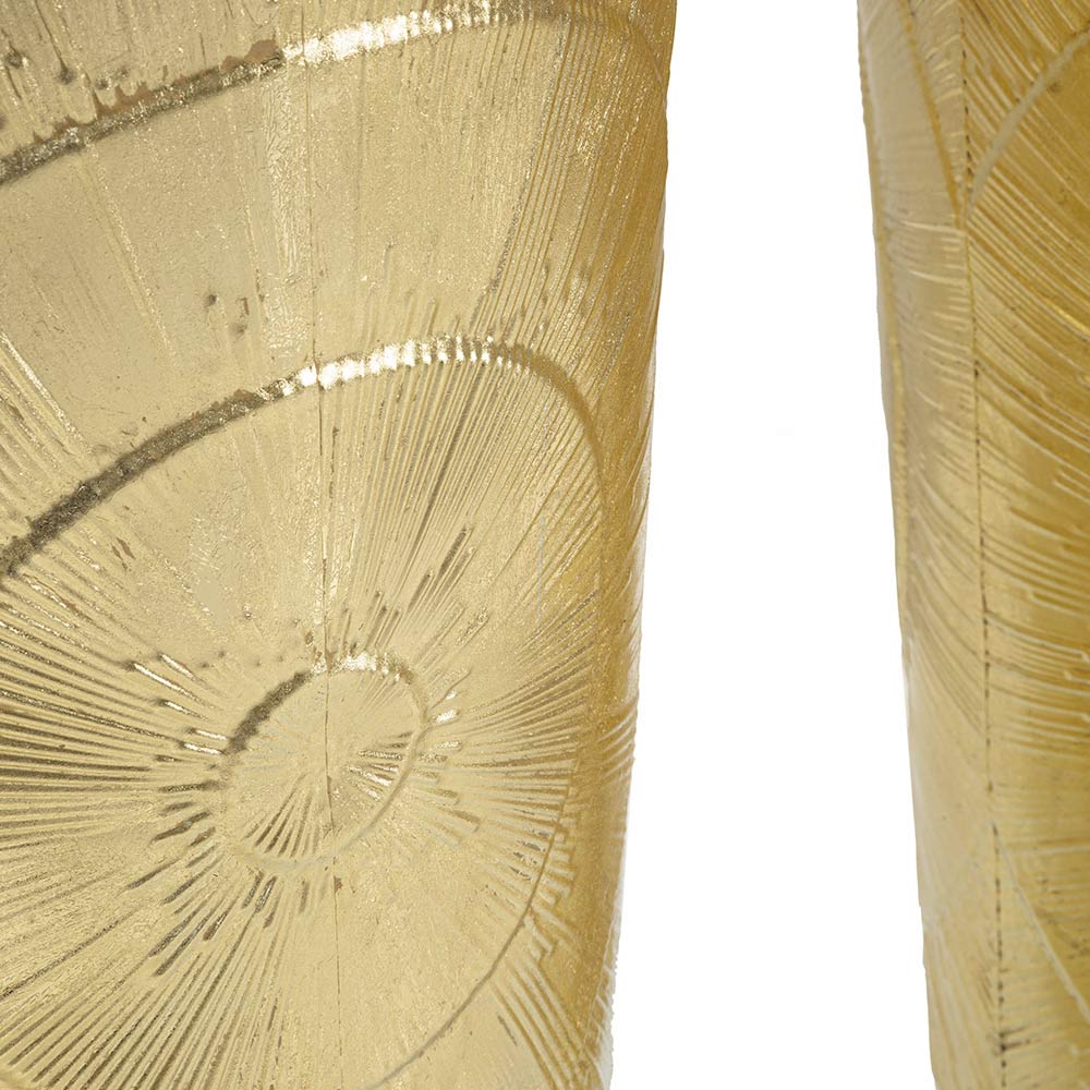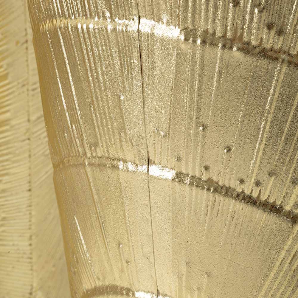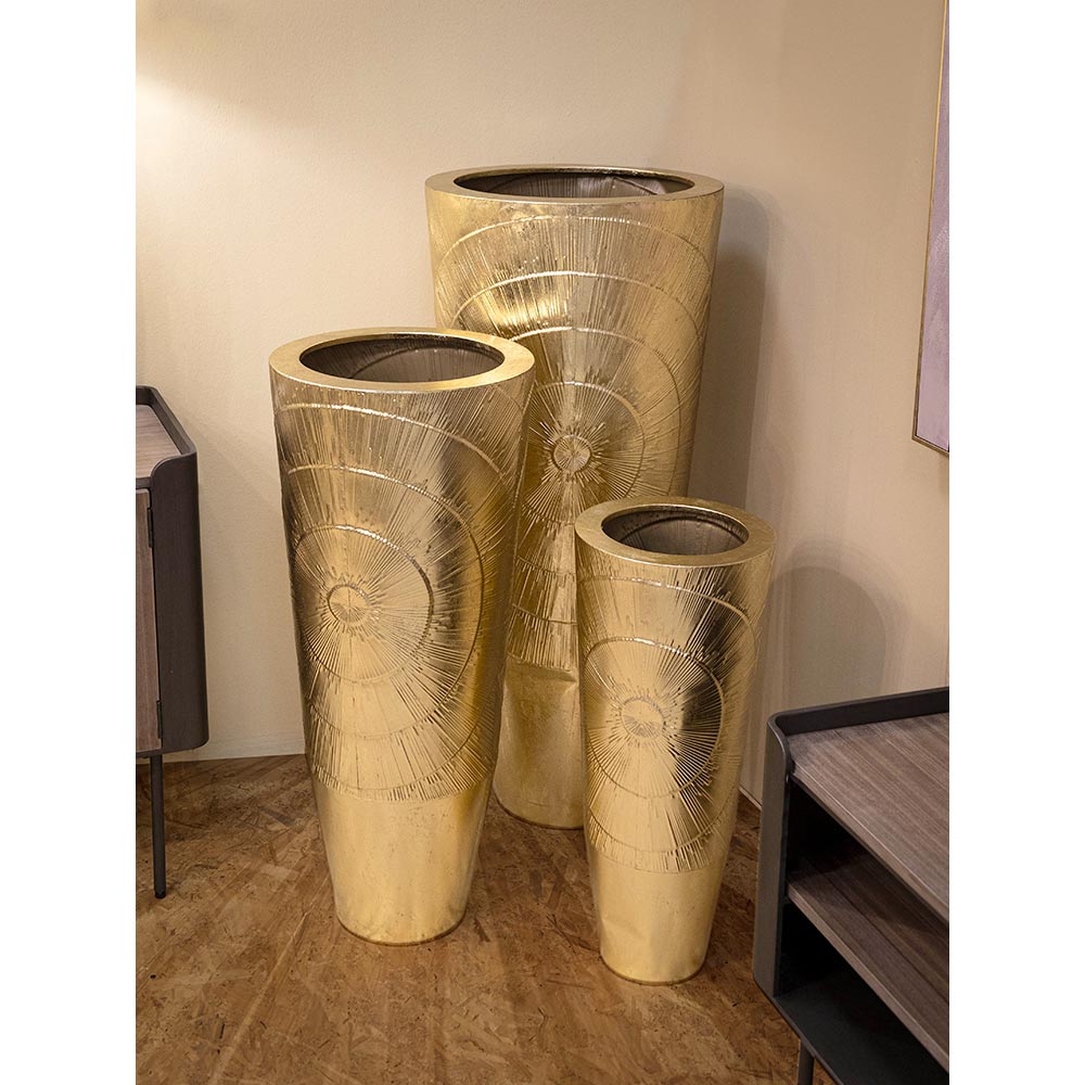 These decorative vases are real sculptures, works of art that capture the eye and elegantly enrich any environment. Their gold tone creates a warm and welcoming visual effect, while the lines engraved in the iron create a radiant effect, which gives movement and life to the smooth surface of the vases.