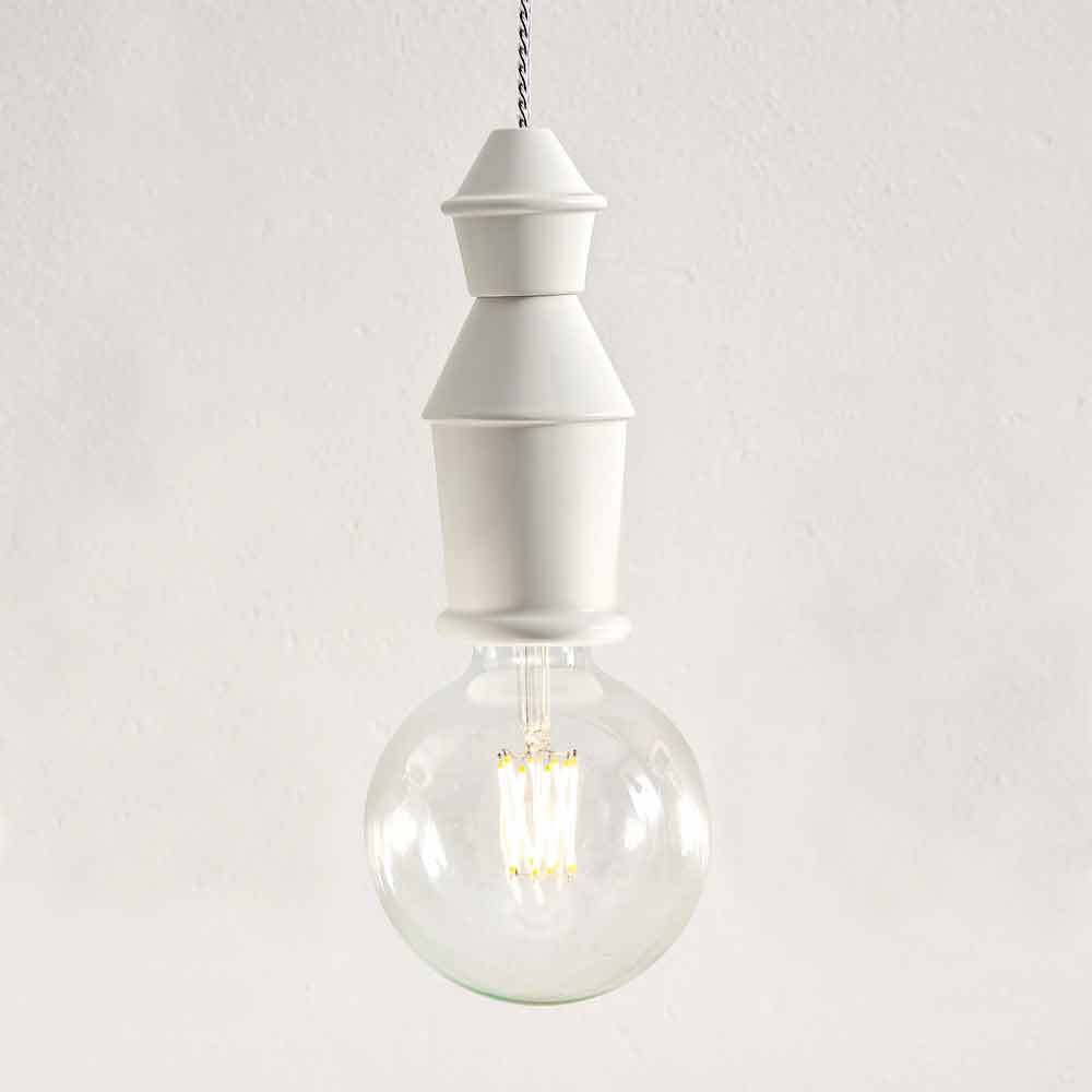Fate is an element loaded with design and refinement capable of recreating striking light points in any environment. Production is carried out in Italy, using only top quality materials. Available in different finishes that are divided into "classic enamels" or "lustre". The finishes belonging to this second category are made using an ancient ceramic technique where a layer of the following precious metals is spread by hand and then fired: 24 carat gold, 22 carat platinum and 90% copper title. Both finishing are available in glossy or matt versions. The electrified cable is made of steel and is covered with a transparent silicone sheath. The lamp is supplied without a light bulb, but is well suited to decorative light bulbs on the market.