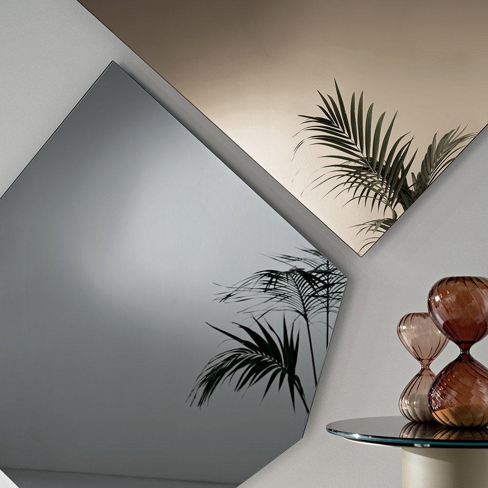 Available in various sizes, the mirror can be used individually or combined to create sophisticated geometric effects on the wall. The elegant bronze and smoked finishes add depth and warmth to the reflective surface.