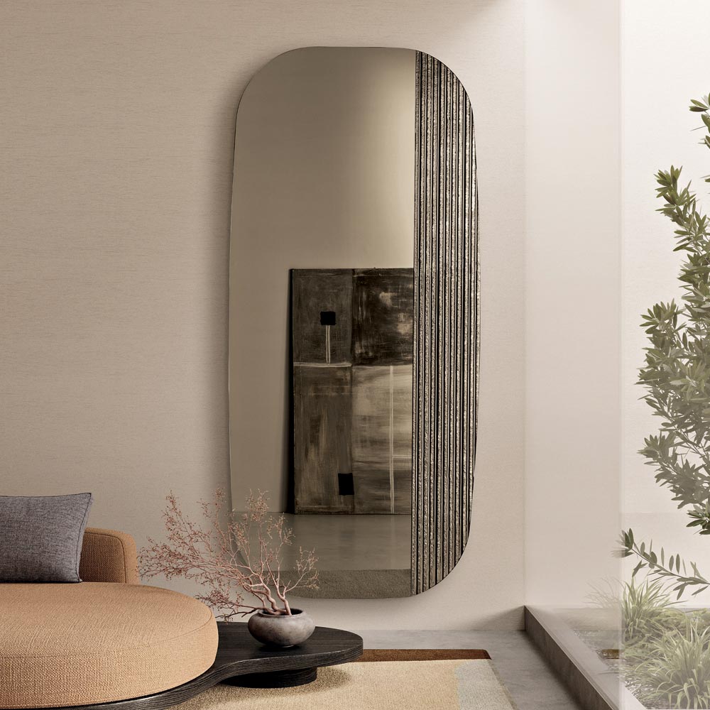 The reflective surface features a contoured shape with gently rounded corners , designed to create a soft and harmonious visual effect. The design is embellished with a tone-on-tone back-silvered ribbed glass insert that adds depth and movement, creating a refined interplay of light and texture on the mirror's surface.