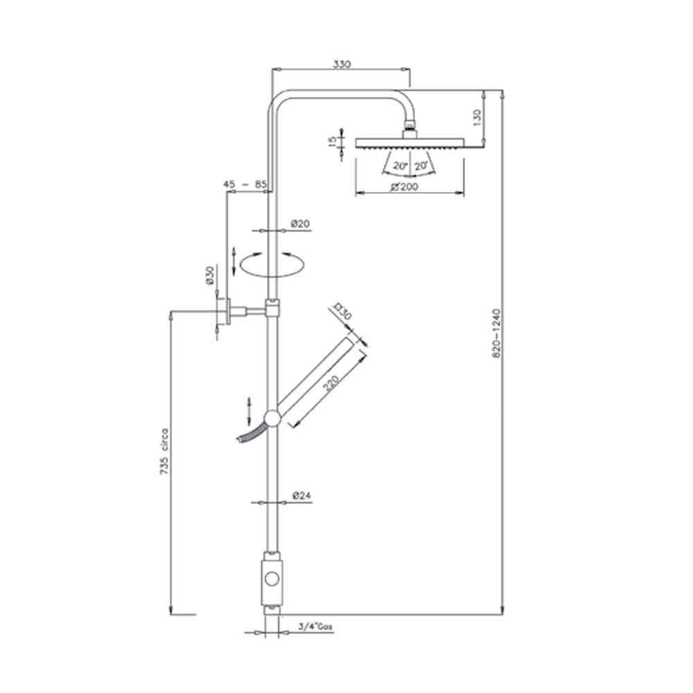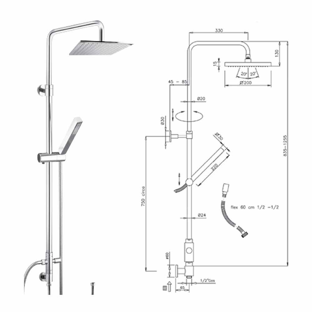 Modern brass shower column with Made in Italy ABS shower head and hand shower.
