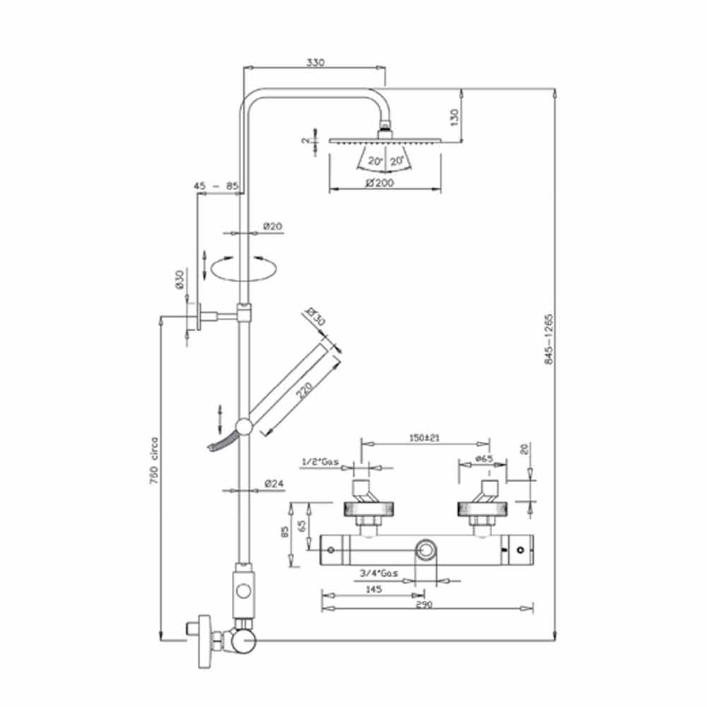 Chromed brass shower column with steel shower head and ABS hand shower, Made in Italy quality product.