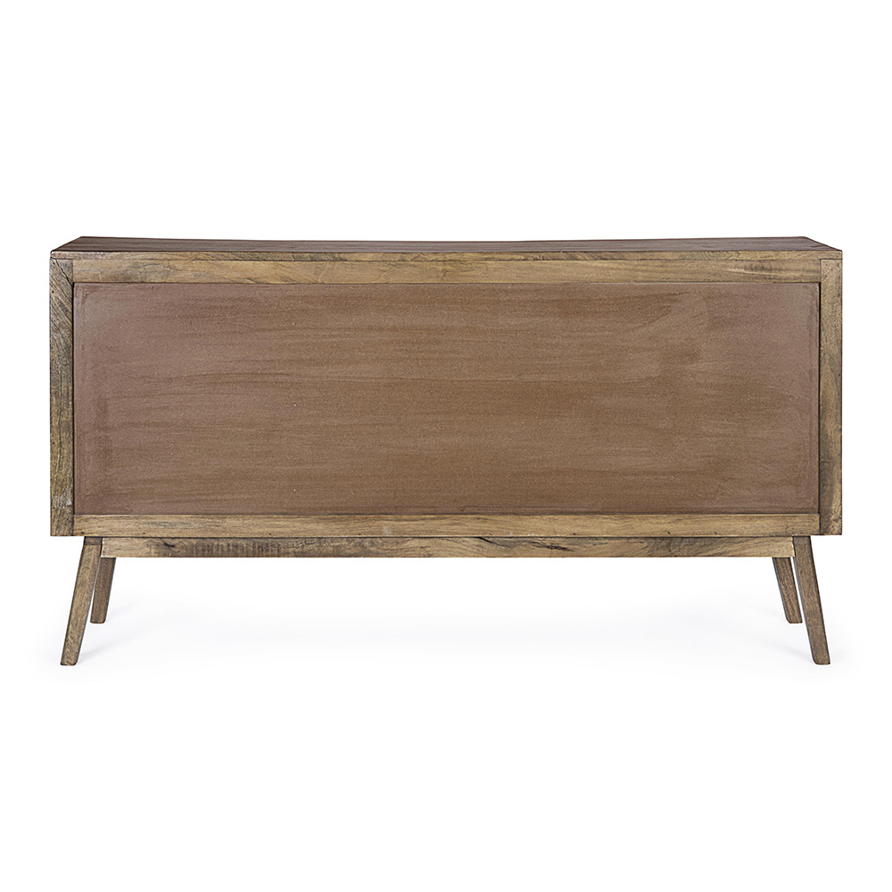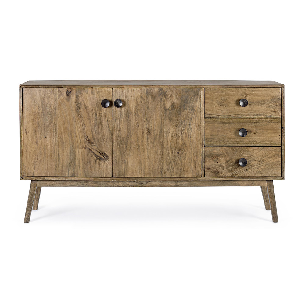 This design sideboard for the living room has a structure and legs to be assembled in mango wood with a water-based finish and back in MDF. The compartment includes a shelf and the knobs are in steel. The result is a vintage accessory with an ethnicflavor.