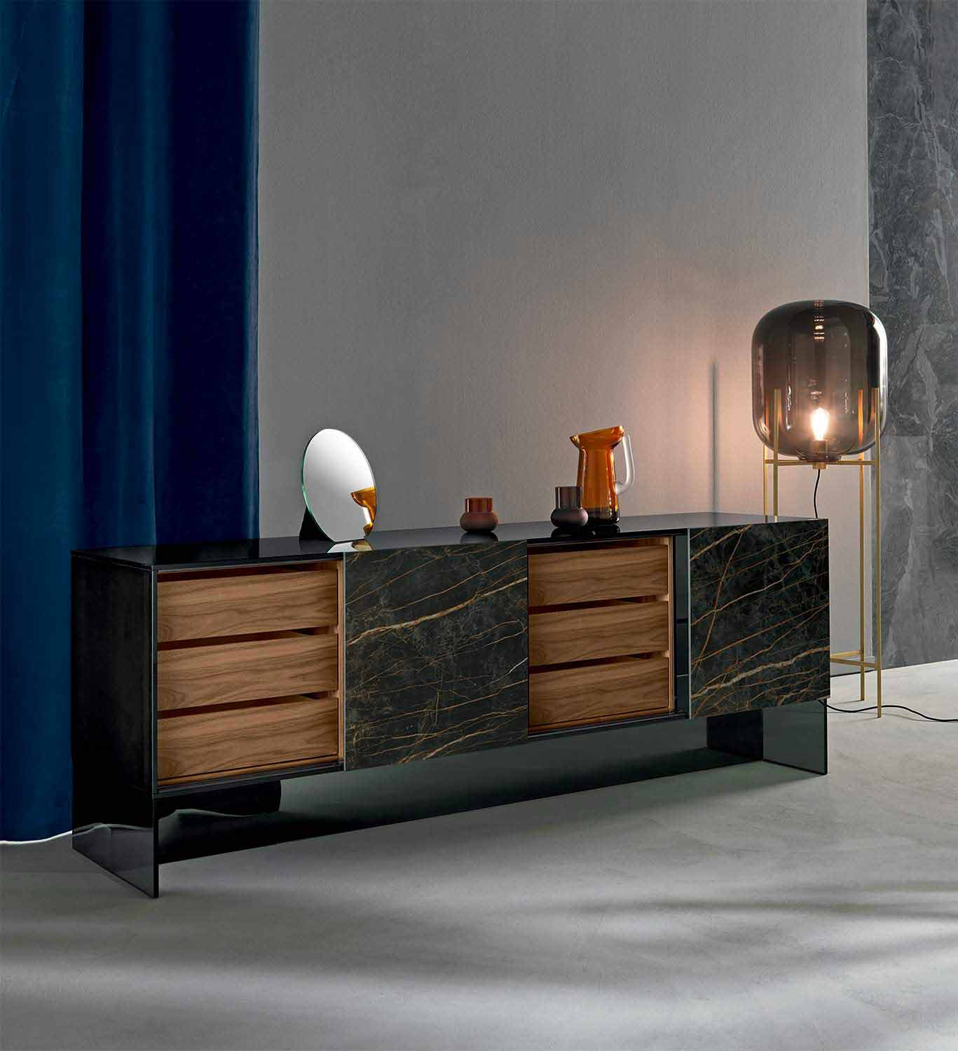 Living room sideboard with a smokey glass structure and two shiny Noir Desir ceramic doors, realized by hand in Italy.